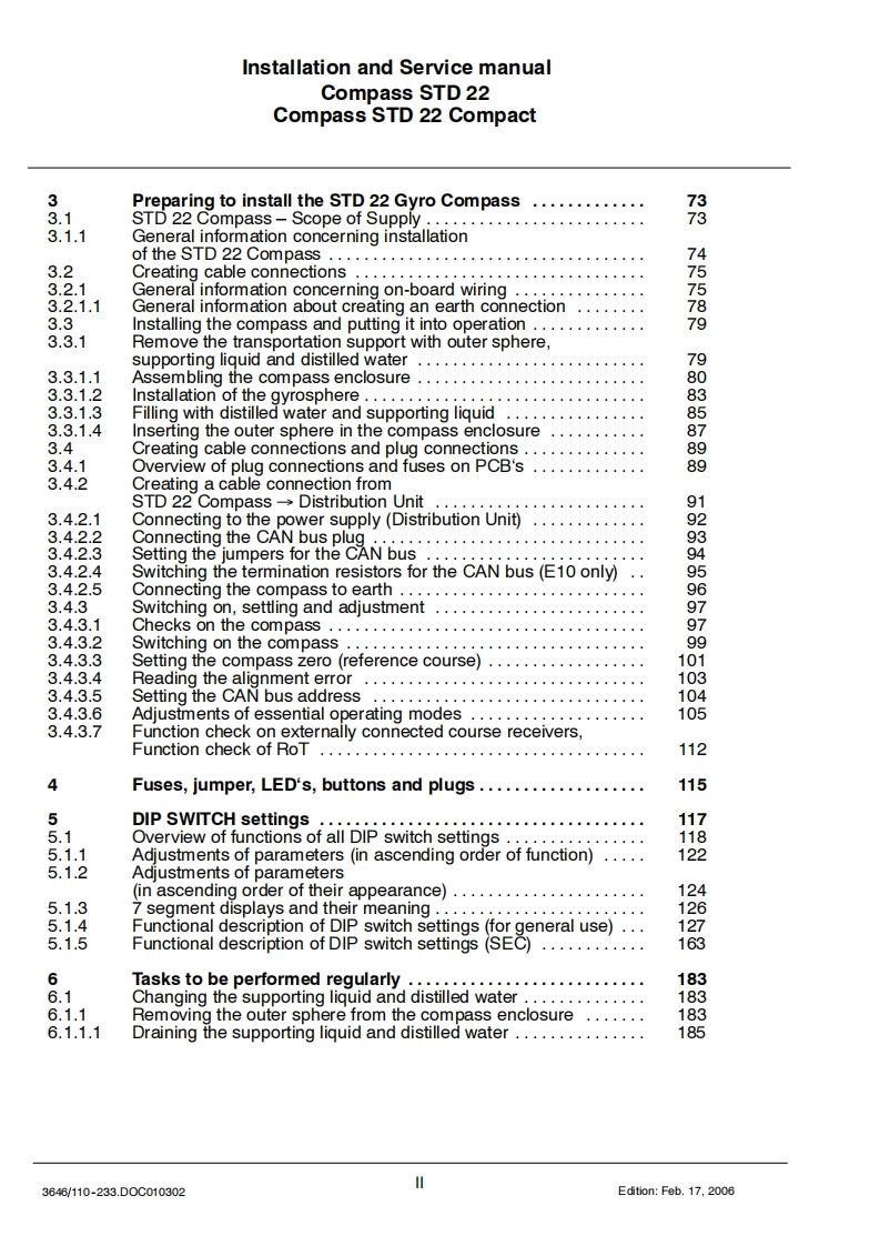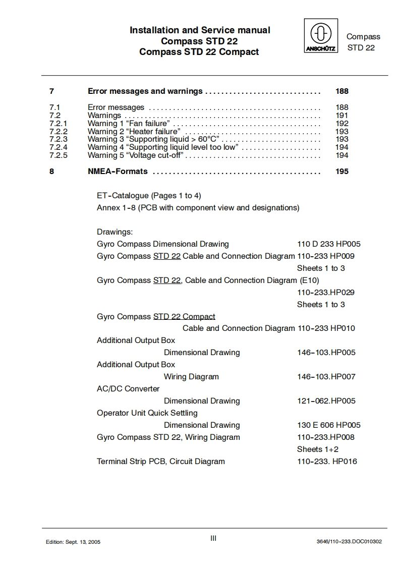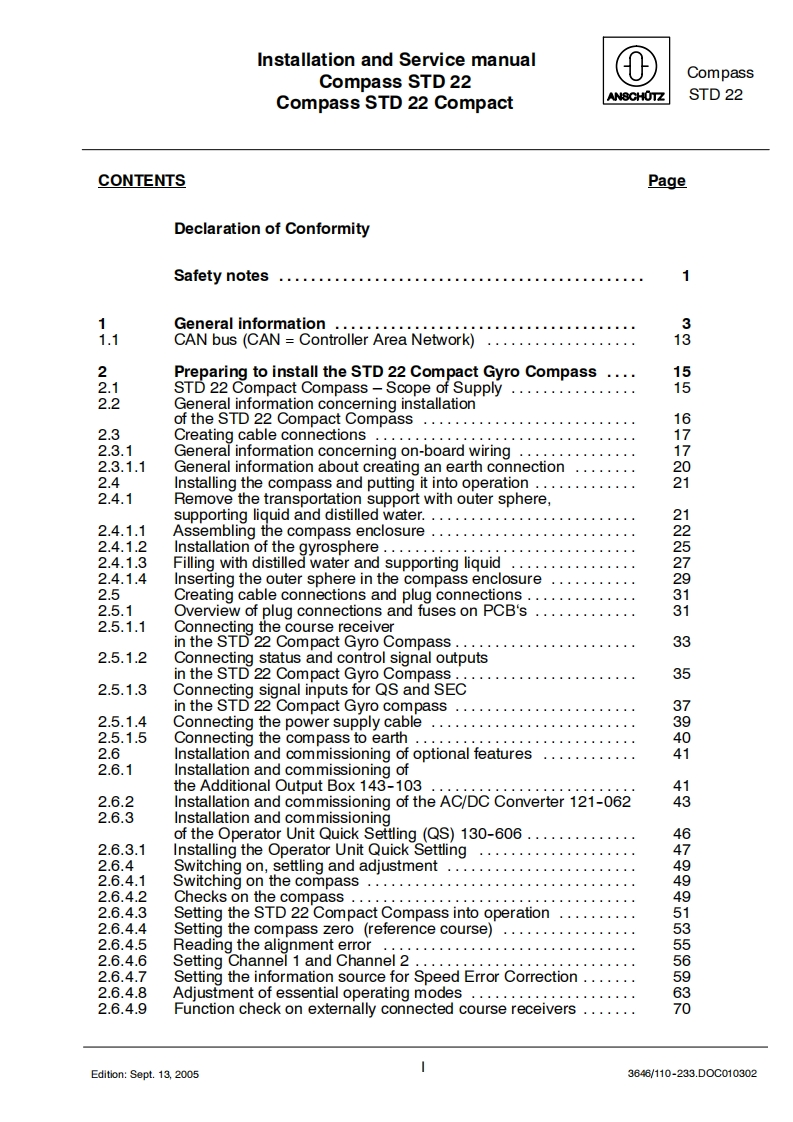 Raytheon AnschutzRaytheon Anschutz GmbHPostfach 1166D-24100 KielGermanyTd+49-431-3019-0Fax+49-431-3019-501Email Service raykiel.comwww.raytheon-anschuetz.deSTD 22 Compact GYRO COMPASSandSTD 22 GYRO COMPASSType110-233Installation and Service manual3646/110-233.D0C010302 Edition:May20,2005Revision:July 1,2005Revision:Sept.13,2005Revision:Nov.28.2005Revision:Feb.17,2006
