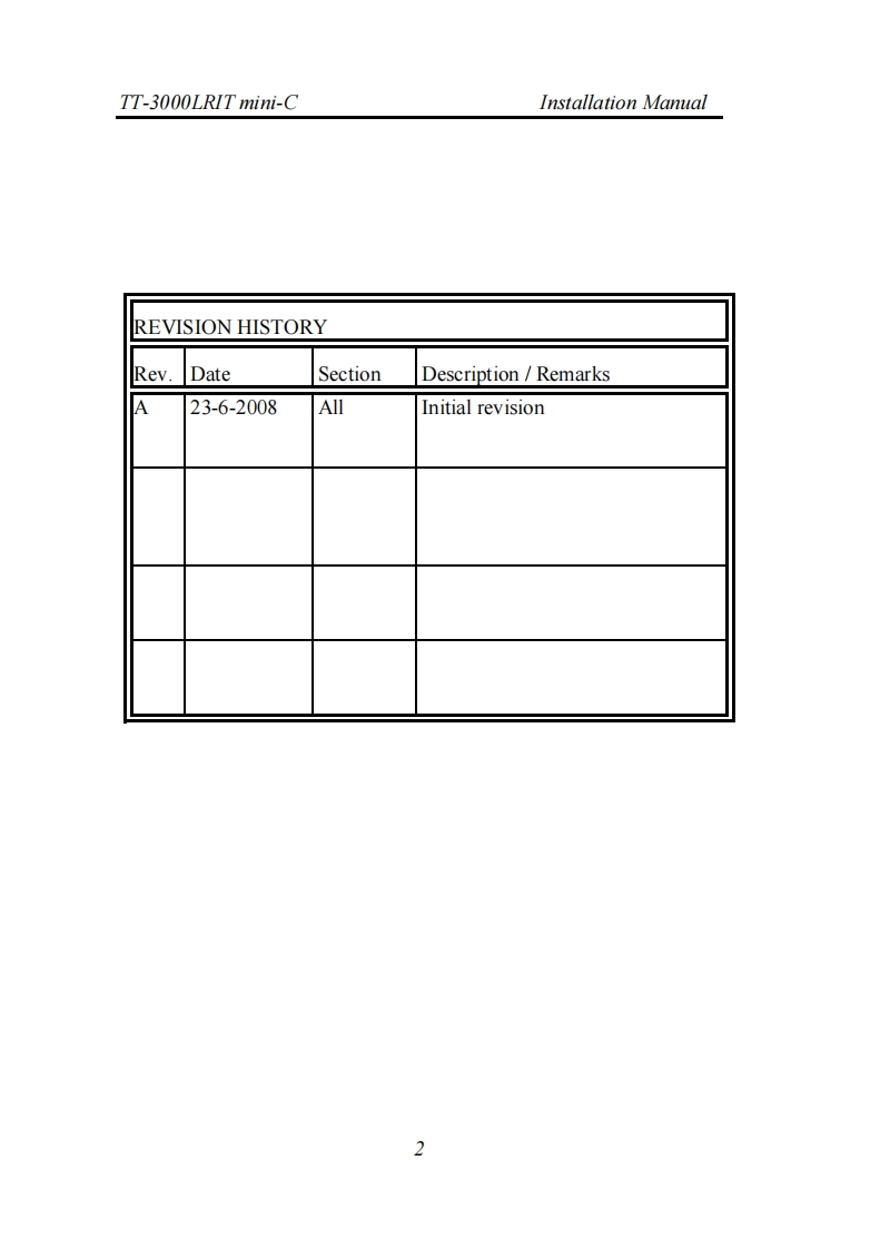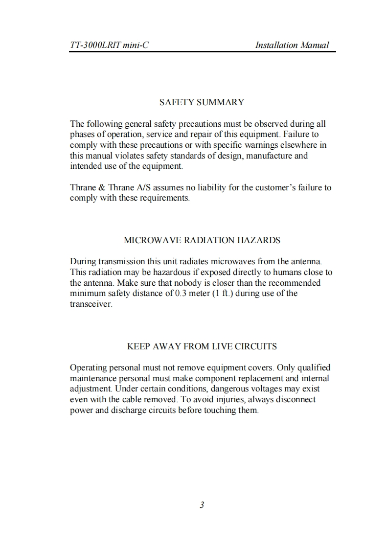TT-3000LRIT mini-CInstallation ManualSAILORby Thrane ThraneTT-3000LRIT mini-CInstallation ManualCopyright Thrane Thrane A/SALL RIGHTS RESERVED2008,Thrane Thrane A/SInformation in this document is subject to change without notice anddoes not represent a commitment on the part of Thrane Thrane A/SDocument number:98-127659Revision:ARelease Date:23d of June 20081