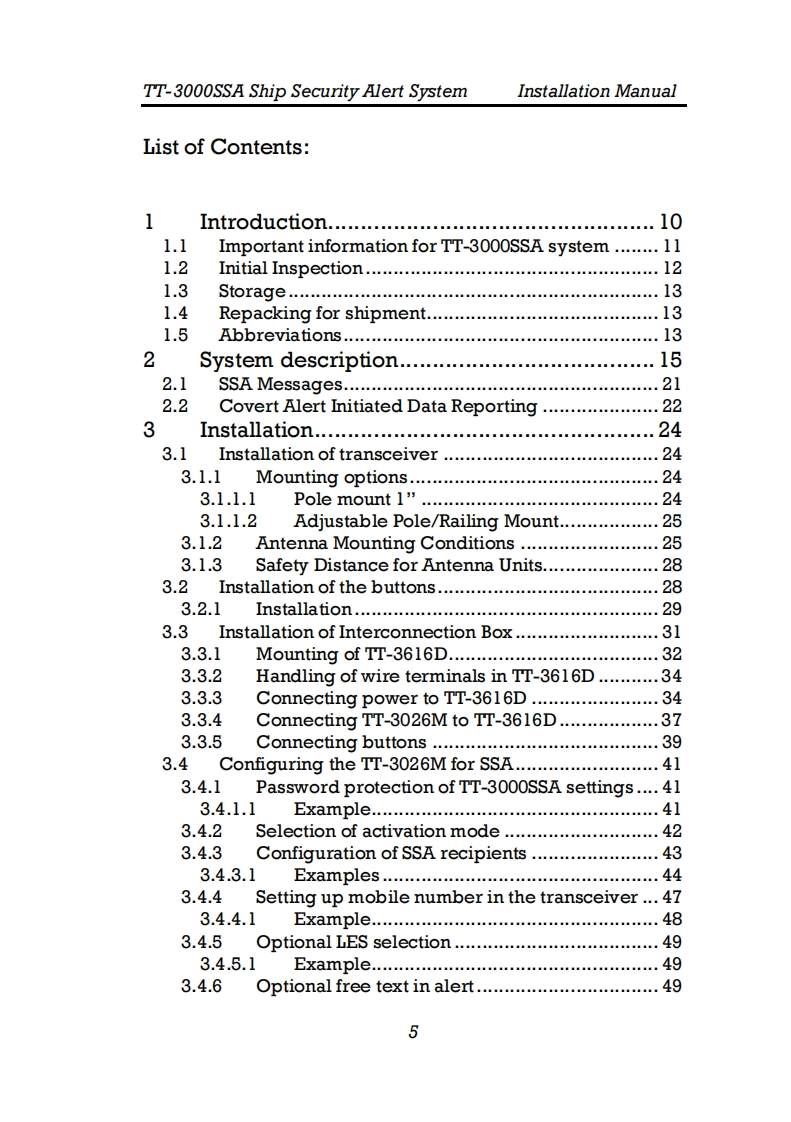 TT-3000SSA Ship Security Alert SystemInstallation ManualSAILOR®by ThraneThraneTT-3000SSA Ship Security Alert SystemInstallation ManualCopyright Thrane Thrane A/SALL RIGHTS RESERVED2006,Thrane Thrane A/SInformation in this document is subject to change withoutnotice and does not represent a commitment on the part ofThrane Thrane A/S.Document number:98-120343Revision:GRelease Date:13th of May 20091