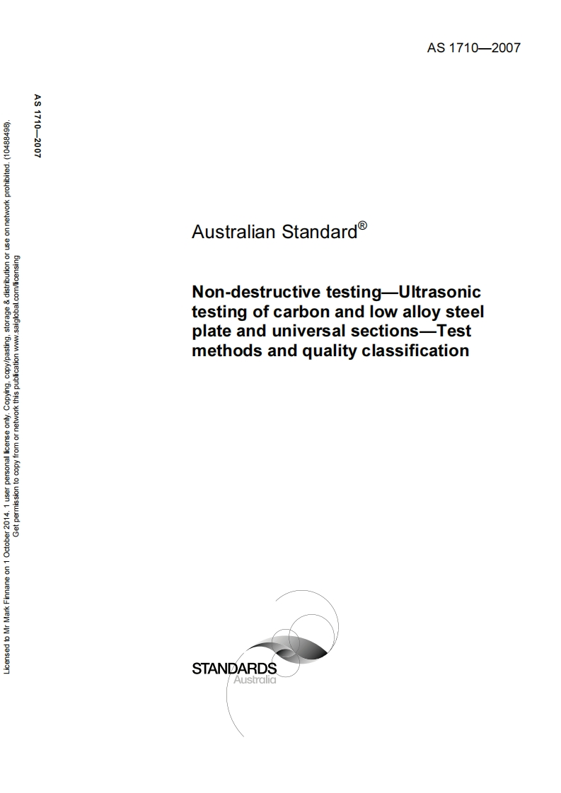 老SAI GLOBALLICENCEforAS 1710-2007 Non-destructive testing-Ultrasonic testing of carbon and low alloy steel plate and universal sections-Testmethods and quality classificationLicensee:Mr Mark FinnaneDate:Wednesday,1 October 2014 9:15 AMLicence AgreementThis is an agreement between the end user of the Product("Licensee")and SAI Global Limited,Level 37,680 George Street,Sydney NSW 2000 AUSTRALIA,ABN 67 050 611 642.1.Definitions and InterpretationsAustralian Standards means Australian Standards and includes Joint ISO/Australian Standards.Joint NZ/Australian Standards.current Draft Australian Standards.and amendments to Australian Standards.Concurrent Users means the maximum number of people able to access the Product at any one time,and is limited to thenumber of Licences purchased.SO Standards means Standards published by the International Organization for Standardization (ISO).for which SAl Global isan authorised distributor.IEC Standards means Standards published by the International Electrotechnical Commission(IEC).for which SAl Global is anauthorised distributor.nternal use means use of the Product within the Licensee's organization.Licence means the right to access and use the Product.Licensee means the purchaser and user of the Product.Product means Australian Standards,ISO Standards and IEC Standards ordered and purchased through the infostore.andClick on the red box above to activate the Licence Agreement scroll bar.See publications covering the same Subject AreaSubscribe to our Free Newsletters about Australian Standards inLegislation;ISO,IEC,BSI and moreLearn how to Manage Standards Collections OnlineLearn about LexConnect,All Jurisdictions,Standards referenced inAustralian legislationKnow when a Standard has changedBecome an SAl Global Standards Sales AffiliateRepresenting hundreds of Standards bodies including:妻SAIGLOBALSW空国四圆a里S瓜JMmC