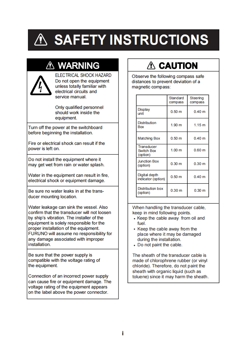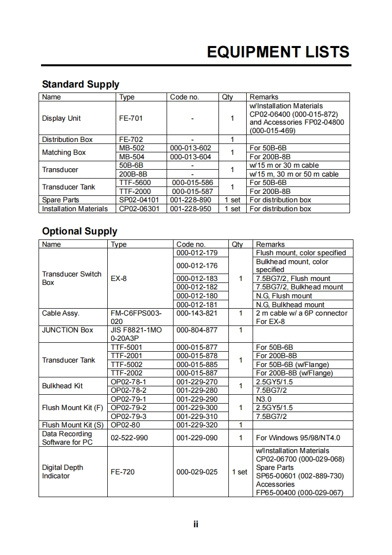 Installation ManualNAVIGATIONAL ECHO SOUNDERFE-700IMPORTANT NOTICE..........SAFETY INSTRUCTIONS.....EQUIPMENT LISTS..…......iSYSTEM CONFIGURATION..................1.MOUNTING...............11.1 Category of Equipment.......11.2 Display Unit.…..11.3 Transducer.….41.4 Distribution Box....…61.5 Matching Box….71.6 Digital Depth Indicator FE-720 (option)...........71.7 Transducer Switch Box EX-8(option)..............91.8 Gate Valve GV-50B-6B,GV-200B-8B(option)92.WIRING......113.CHANGING POWER SPECIFICATIONS......204.ADUSTMENTS.224.1 Transducer Setting..224.2 Setting the Time...........24PACKING LISTS..A-1OUTLINE DRAWINGS..-1INTERCONNECTION DIAGRAMS..............…S-1FURUNO ELECTRIC CO.,LTD.www.furuno.co.jpAll brand and product names are trademarks,registered trademarks or service marks of their respective holders.