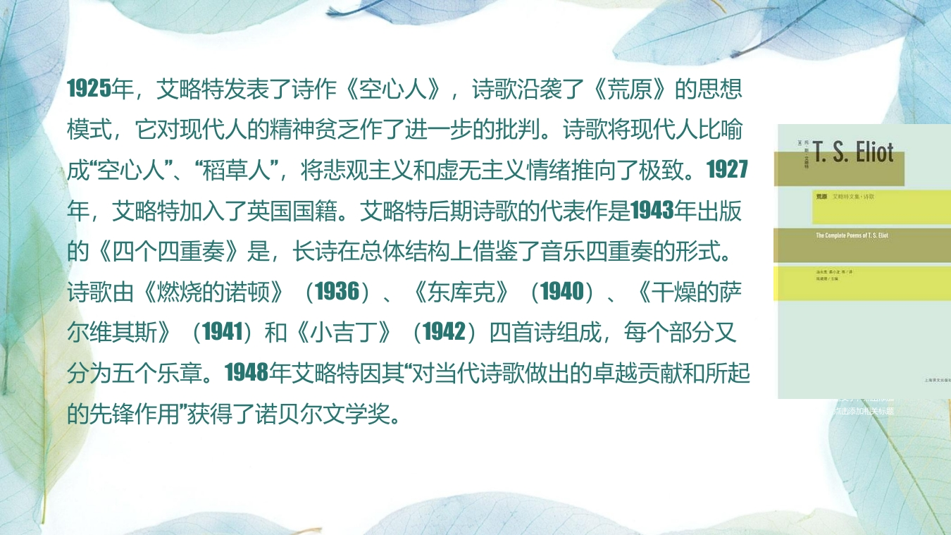 21第八章20世纪文学(上)第二章艾略特荒原348072@abc7小时前发布关注私信1.18MB16页02321第八章20世纪文学(上)第二章艾略特荒原此内容为付费资源,请付费后查看¥16¥19黄金会员免费钻石会员免费立即购买您当前未登录!建议登陆后购买,可保存购买订单付费资源 第1页 / 共16页 第2页 / 共16页 第3页 / 共16页 第4页 / 共16页 第5页 / 共16页 试读已结束,还剩11页,您可下载完整版后进行离线阅读 THE ENDMatlab仿真PPT模板人工智能工程机械 文本预览 第八章20世纪文学(上)第二节艾略特《荒原》主讲人:孙霄(西安外国语大学) 查看更多 收起部分 喜欢就支持一下吧收藏