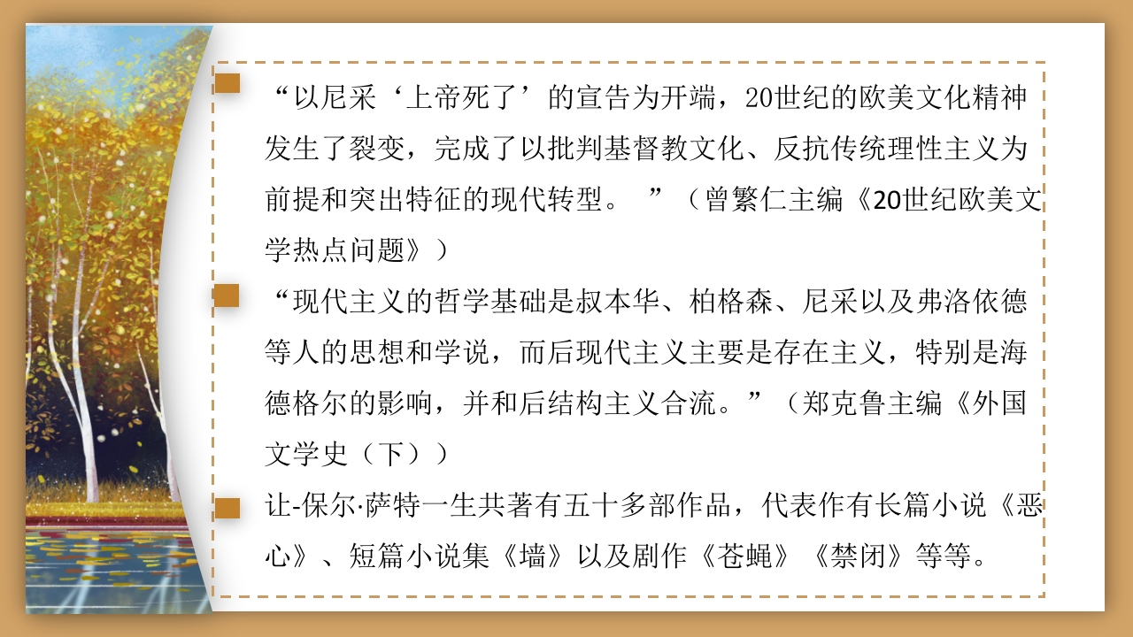 26第九章20世纪文学(下)第一节存在主义文学的探讨348072@abc7小时前发布关注私信1.78MB16页05026第九章20世纪文学(下)第一节存在主义文学的探讨此内容为付费资源,请付费后查看¥16¥19黄金会员免费钻石会员免费立即购买您当前未登录!建议登陆后购买,可保存购买订单付费资源 第1页 / 共16页 第2页 / 共16页 第3页 / 共16页 第4页 / 共16页 第5页 / 共16页 试读已结束,还剩11页,您可下载完整版后进行离线阅读 THE ENDMatlab仿真PPT模板人工智能工程机械 文本预览 第九章20世纪文学(下第一节存在主义文学主讲人:邹莹(西安外国语大学 查看更多 收起部分 喜欢就支持一下吧收藏