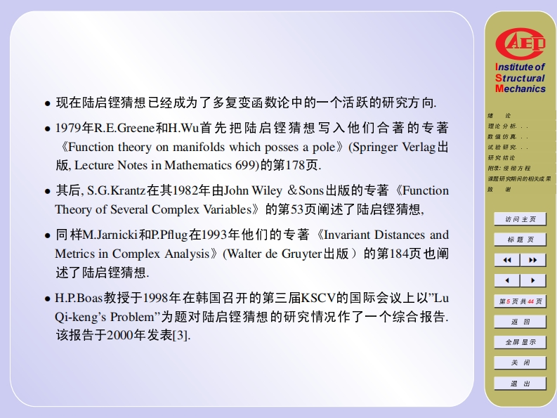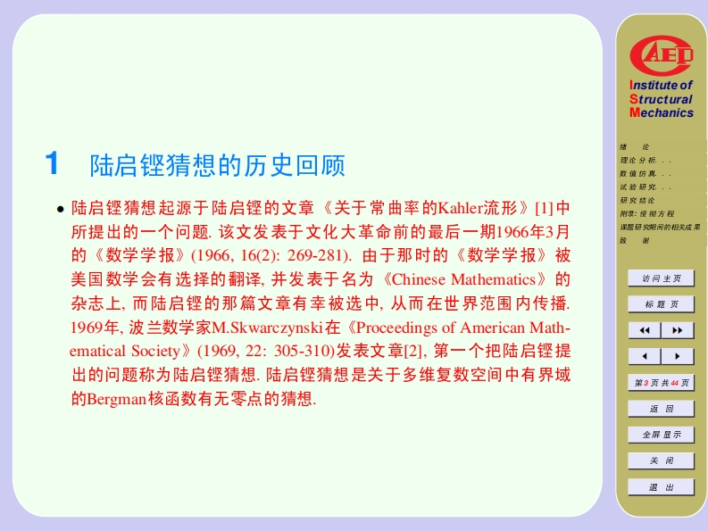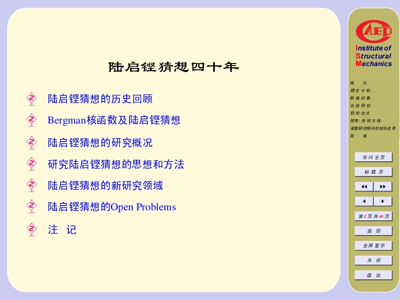②国家基金委和教育部博士点基金资助项目AED2006年10月13日·中科院数学所学术报告厅Institute ofStructuralMechanics绪理论分板.··数值仿真。··陆启铿猜想四十年试验研究··研究结论附黄:侵彻方程课驱研充期间的相关成果Forty Years on Lu Qi-Keng Conjecture致家访问主页标题页殷慰萍第1页共44页首都师范大学数学科学学院返回全屏显示wpyin@263.net or wyin@mail.cnu.edu.cn关闭退出