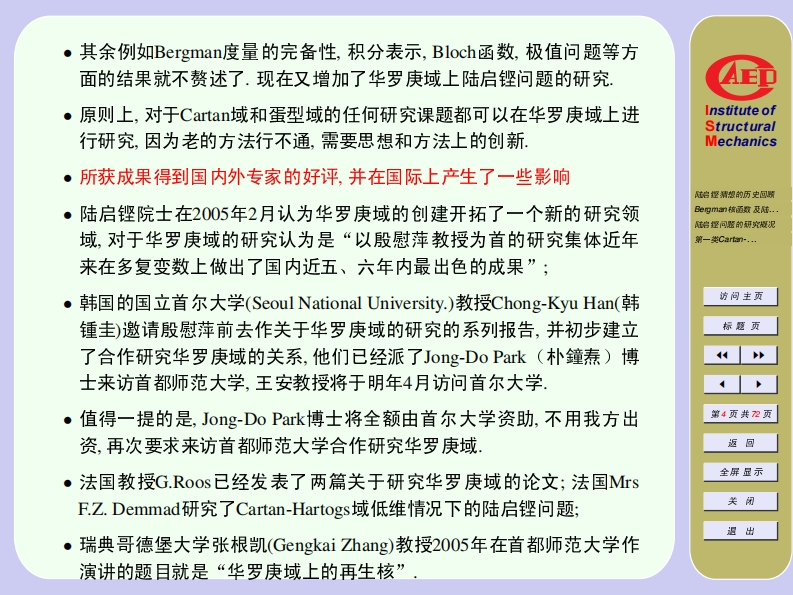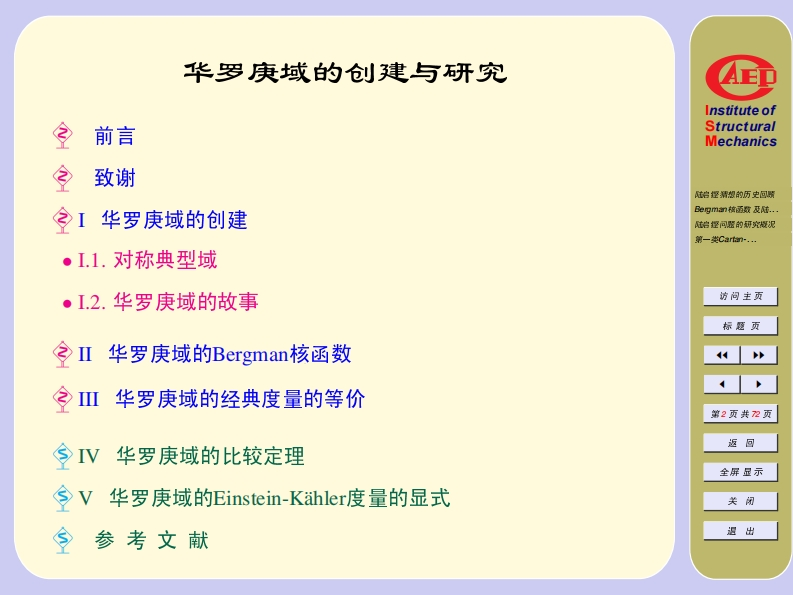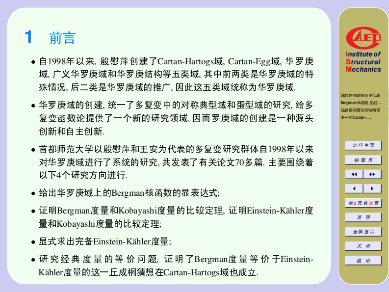国家基金委和教育部博士点基金资助项目2006年12月22日·中科院数学所学术报告厅Institute ofStructuralMechanics治捏精想的历史回明华罗庚域的创建与研究Be四mn被函数及陆..墙经问驱的可究概泥第-数Carm-.…The Construction and Research of Hua Domains访问主页标题页殷慰萍第1页共2页首都师范大学数学科学学院返回全屏显示wpyin@263.net or wyin@mail.cnu.edu.cn关闭退出