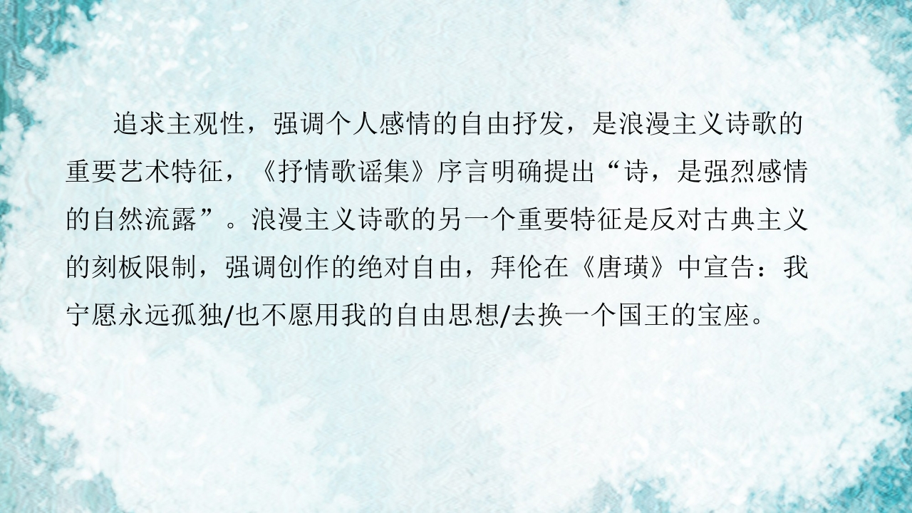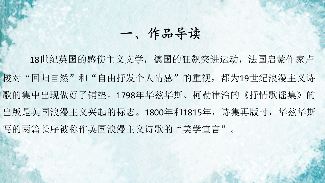 第五章浪漫主义诗歌的兴起十九世纪文学的序章348072@abc10小时前发布关注私信1.98MB11页049第五章浪漫主义诗歌的兴起十九世纪文学的序章此内容为付费资源,请付费后查看¥16¥19黄金会员免费钻石会员免费立即购买您当前未登录!建议登陆后购买,可保存购买订单付费资源 第1页 / 共11页 第2页 / 共11页 第3页 / 共11页 第4页 / 共11页 第5页 / 共11页 试读已结束,还剩6页,您可下载完整版后进行离线阅读 THE ENDMatlab仿真PPT模板人工智能工程机械 文本预览 第五章19世纪文学(上)第一带十九世纪浪漫主义诗歌主讲人:乔琦(西安外国语大学) 查看更多 收起部分 喜欢就支持一下吧收藏
