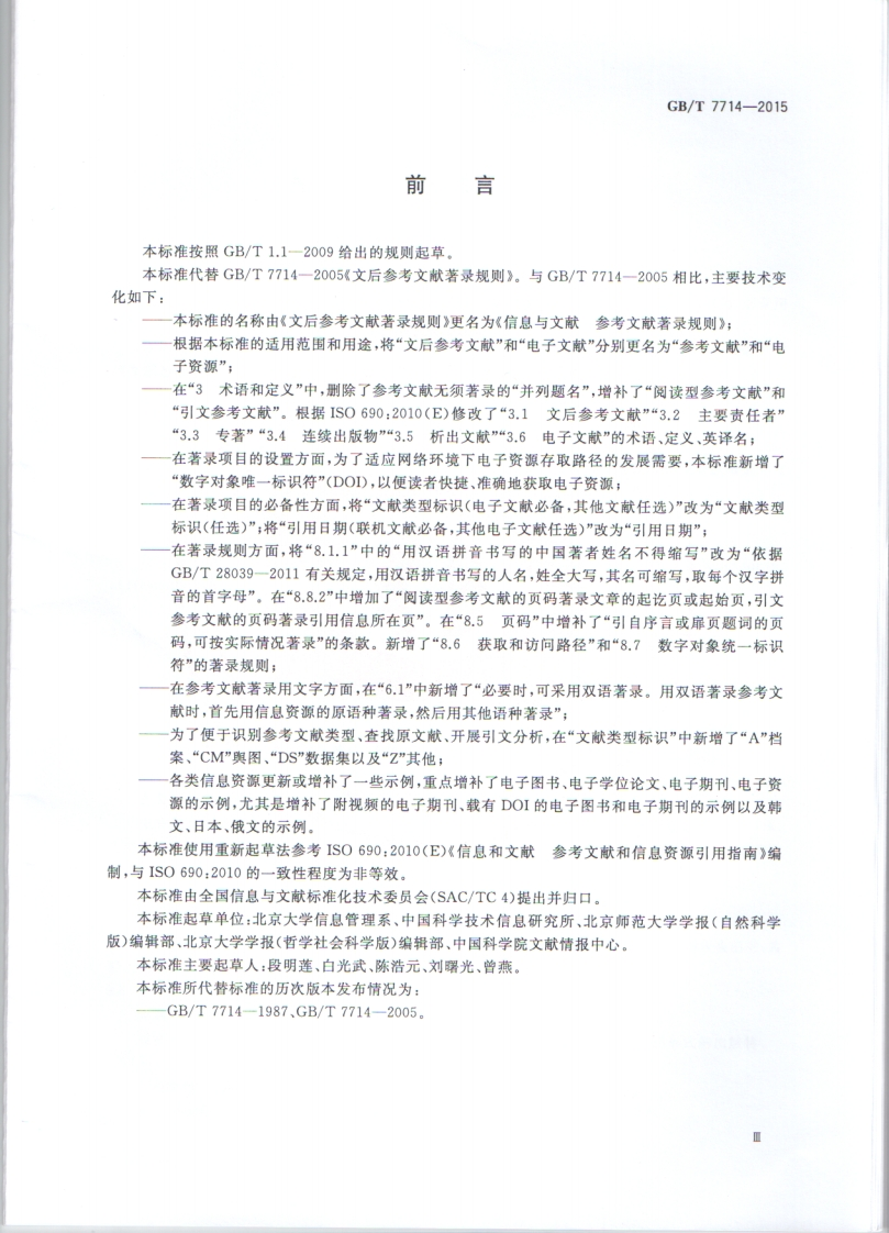 1CS01.140.20A14GB中华人民共和国国家标准GB/T7714-2015代替GB/T7714一2005信息与文献参考文献著录规则Information and documentation-Rules for bibliographic referencesand citations to information resources(ISO 690:2010,Information and documentation-Guidelines forbibliographic references and citations to information resources,NEQ)2015-05-15发布2015-12-01实施中华人民共和国国家质量监督检验检疫总局Φ中国国家标准化管理委员会发布