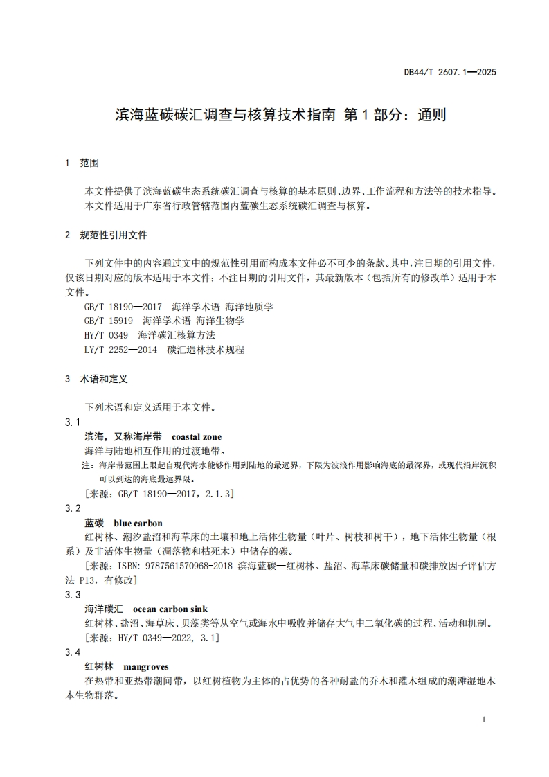 ICS93.160CCS P 550844广东省地方标准DB44/T2607.1-2025滨海蓝碳碳汇调查与核算技术指南第1部分:通则Technical Guide for the Survey and Accounting of Coastal Blue Carbon Sink,Part 1:General Principles2025-01-23发布2025-04-23实施广东省市场监督管理局发布