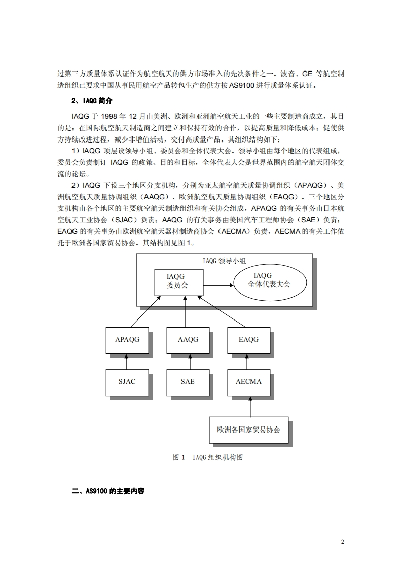 国际航空航天质量管理体系标准(AS9100)现状及技术发展动态江元英曹秀玲林树茂摘要:本文介绍了国际航空航天质量管理体系标准(AS9100)的产生背景和主要内容,分析并归纳了其应用情况、存在的问题及目前修订工作的技术动态。文中还介绍了国际航空航天质量协调组织(1AQG)的组成和战略,整理、归纳了其发布的9100系列标准最新目录。一、概述1、AS9100标准产生的背景及演变AS9100标准的产生源于航空航天工业的组织及其供方共同的需求。航空航天工业的全球化以及地区/国家要求和期望的差异,使航空航天工业的组织及其供方面临严峻的挑战。一方面,一个组织要面对众多的供方,组织面临着如何保证从世界各地和供应链中各层次的供方采购高质量的产品和实现采购要求规范化的挑战。另一方面,一个供方也会面对众多的顾客,供方既要对不同的顾客交付具有不同质量期望和要求的产品,也要应对众多顾客要求不同的频繁的第二方审核。因此,不论从组织还是组织的供方,都希望建立一个国际航空航天质量管理体系标准,统一航空航天质量管理体系要求,并用第三方认证取代对众多供方的第二方审核。2000版1SO9001标准强化了标准的通用性和原则性,适用于所有产品类别、不同规模和各种类型的组织。为了扩大2000版S09001标准的适用性,国际标准化组织质量管理与质量保证标准化技术委员会(1S0TC176)扩大了与相关技术委员会和行业的合作,制订了有关行业的国际质量管理体系标准。如SOTC176与国际汽车特别工作组合作,制订了汽车行业的国际标准SO/TS16949《质量管理体系一汽车生产件及相关维修零件组织应用1S09001:2000的特别要求》,与医疗器械质量管理及相关方面的技术委员会合作,制订了医疗器械行业的国际标准1S013485《医疗器械-质量管理体系-用于法规的要求》,与电气通讯服务行业合作,制订了电讯行业的质量管理体系标准TL9000等。为了制订航空航天行业的质量管理体系标准,国际标准化组织航空航天技术委员会(ISO/TC20)成立了WG11工作组,以美国汽车工程师协会(SAE)的AS9000标准为蓝本,按照ISO标准框架制订国际航空航天质量管理体系标准。国际航空航天质量协调组织(AQG)成立后,接替了ISO/TC20WG11工作组的工作,负责国际航空航天质量管理体系标准的制定工作。为了在最大范围内统一航空航天工业系统质量管理体系要求,提高产品质量,AQG于2001年3月发布了国际航空航天质量管理体系标准IAQS9100《航空航天质量体系一设计、开发、生产、安装和服务的质量保证模式》的最终草案,根据该草案,SAE于2001年8月等同发布了AS9100A版标准(包括以IS09001:1994和1S09001:2000为基础的两个部分,1994年修订为AS9100B,取消了基于IS09001:1994的部分),并将依据该标准通