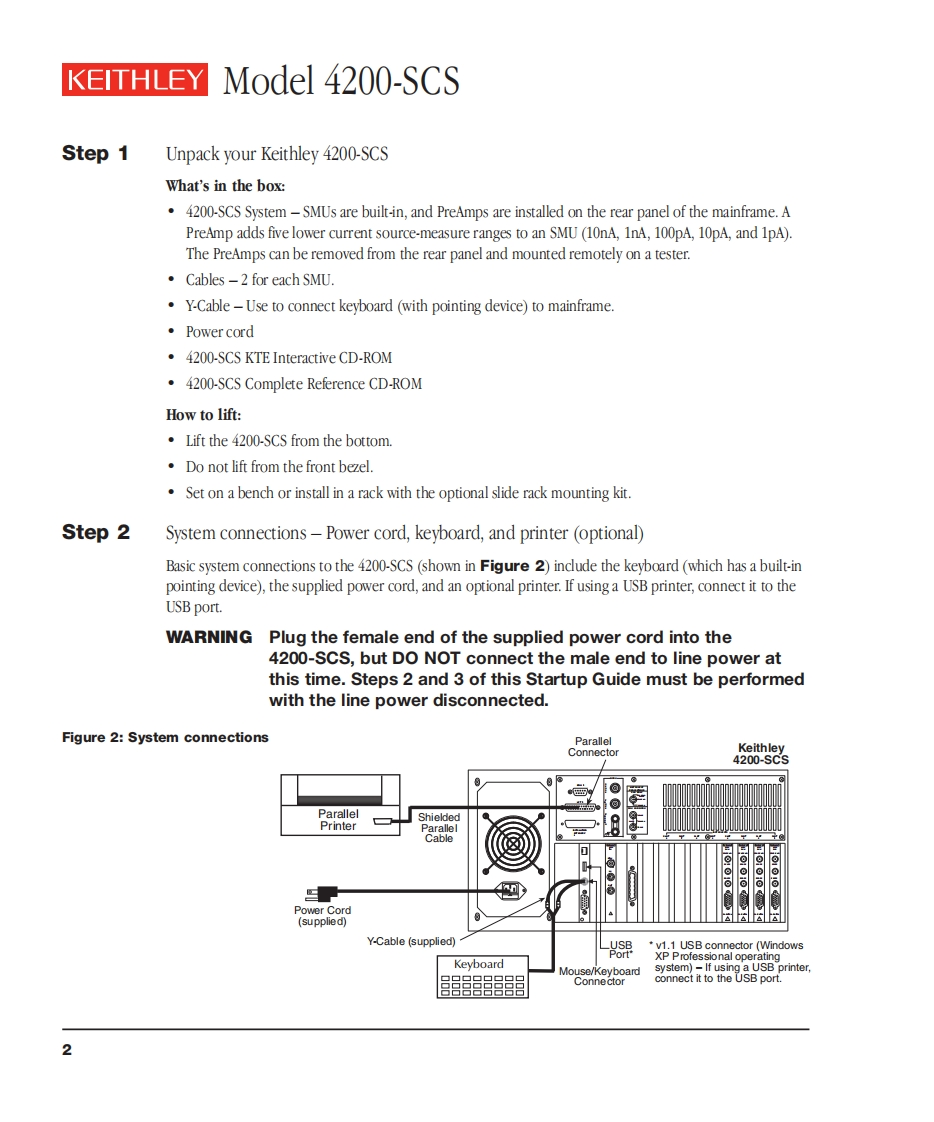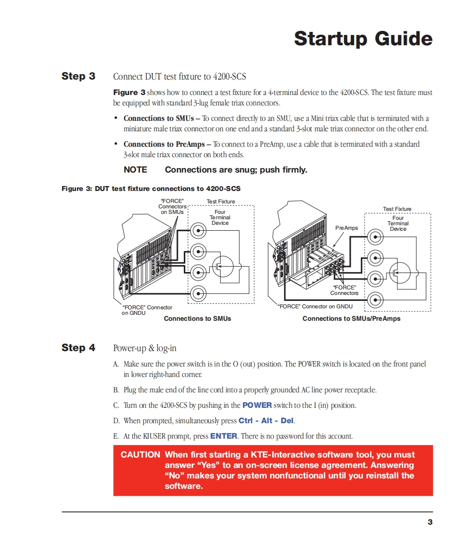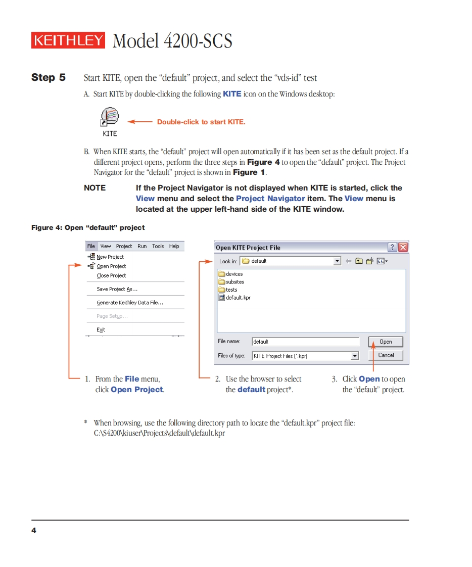 KEITHLEY Model 4200-SCSStartup GuideStart Here!It's easy..…Step 1Unpack your Keithley 4200-SCSStep 2System connections -Power cord,keyboard,and printer (optional)Step 3Connect DUT test fixture to 4200-SCSStep 4Power-up log-inStep 5Start KITE,open the"default"project,and select the"vds-id"testStep 6Test definitionStep 7Run"vds-id”testStep 8View data sheetStep 9View graphStep 10Printing and exporting dataThis Startup Guide selects the "default"project and runs the"vds-id"test.If you wish to select a differentproject and/or test,you must modify the procedures accordingly.Figure 1 shows how the KITE windowwill look after the"default"project and "vds-id"test is selected.Figure 1:KITE interface ("default"project shown with "vds-id"test selected)Project NavigatorSelected TestToolbarKITE Workspacedefault Keihley Interactive Test (OFFLINE)[vds-id11]-包☒Fie view Profxt Ran Tooks windo-×Interactive Test Module:vds-idD■@Site:1Defiriion Sheet Graph StabusProject ToeeUID0SMU2白之E4 mminal-n-城FORCEHEASURE复切SweepV [Master)Meatue l YESype:Lneat:Te-010A111Step:0.1V01aYE edPonts:51一☑e☑12gmSMU3BukGNDU%2FORCEMEASUREFORCEMEASURE1Step V Ma:terMea:ure I NAdiode11Meaiure V-NA☑慢d白fca34clSource5MU1-FORCEMEASUREgis:V CVProiecivie时:出:,Message AreaPA-716ReV.C/11-031