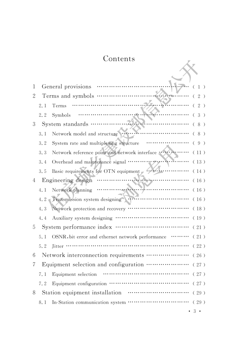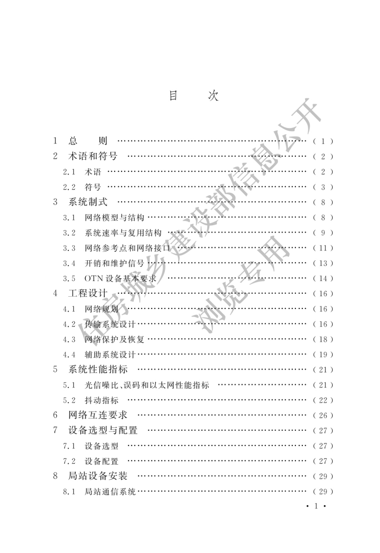 前言本标准是根据住房和城乡建设部《关于印发2015年江程建设标准规范制订、修订计划的通知》(建标〔2014)189号)的要求,由中讯邮电咨询设计院有限公司会同有关单位共同编制完成的。本标准在中华人民共和国通信行业标准《光传送网(OTN)工程设计暂行规定》YD5208一2014和光传送网(OTN)工程验收暂行规定》YD5209一2014的基础上,编制组进行了广泛的调查研究,认真总结实践经验,并在文泛征求意见的基础上,最后经审查定稿。本标准的主要技术内容是:总则、术语和符号、系统制式、工程设计、系统性能指标、网络互连要求、设备选型与配置、局站设备安装、维护工具及仪表配置、性能测试及功能检查、工程验收等。本标准由住房和城乡建设部负责管理,中讯邮电咨询设计院有限公司负责具体技术内容的解释。本标准在执行过程中,如有需要修改和补充之处,请将意见和相关资料寄送中讯邮电咨询设计院有限公司(地址:北京市首体南路9号主语商务中心3号楼,邮政编码:100048)。本标准主编单位:中讯邮电咨询设计院有限公司华信咨询设计研究院有限公司本标准参编单位:中国移动通信集团设计院有限公司上海邮电设计咨询研究院有限公司中国通信建设集团有限公司本标准主要起草人员:陈文雄武清华刘刚张传熙沈梁倪玮习建华张纬卿李书森王亦炜1