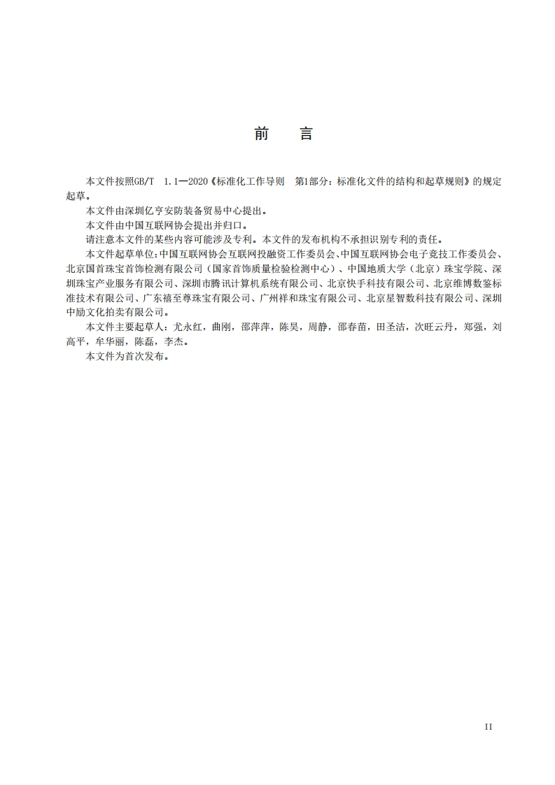 互联网珠宝玉石鉴定认证数字化融合规范SpecificationsfortheDigitalIntegrationofInternetGemsandJewelleryIdentificationandCertification348072@abc5天前发布关注私信0.79MB20页043互联网珠宝玉石鉴定认证数字化融合规范SpecificationsfortheDigitalIntegrationofInternetGemsandJewelleryIdentificationandCertification此内容为付费资源,请付费后查看¥16¥19黄金会员免费钻石会员免费立即购买您当前未登录!建议登陆后购买,可保存购买订单付费资源 第1页 / 共20页 第2页 / 共20页 第3页 / 共20页 第4页 / 共20页 第5页 / 共20页 试读已结束,还剩15页,您可下载完整版后进行离线阅读 THE END标准规范 文本预览 ICS35.240.99CCS LOO团体标准T/ISC0060-2024互联网珠宝玉石鉴定认证数字化融合规范Specifications for the Digital Integration of Internet Gems and JewelleryIdentification and Certification2024-09-03发布2024-10-03实施中国互联网协会发布 查看更多 收起部分 喜欢就支持一下吧收藏