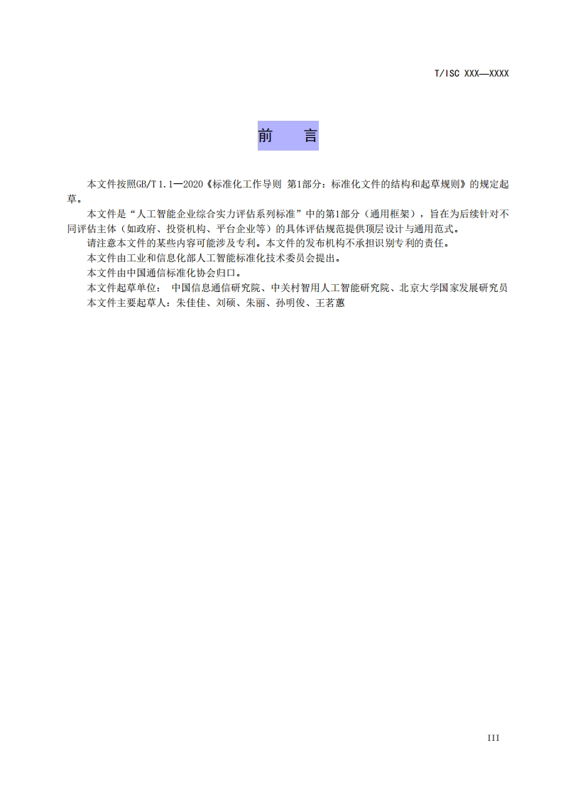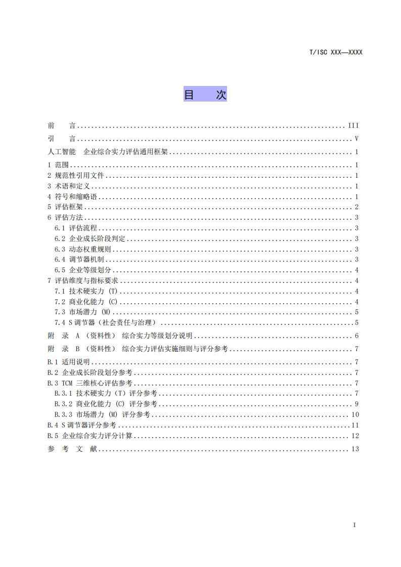 ICS35.x××CCS Lxx团体标准T/ISC XXX-XXXX人工智能企业综合实力评估通用框架General Framework for Comprehensive Strength Assessment of ArtificialIntelligence Enterprises在提交反馈意见时,请将您知道的相关专利与支持性文件一并附上。(征求意见稿)2025-12-13XXXX-XX-XX发布XXXX-XX-X实施中国互联网协会发布
