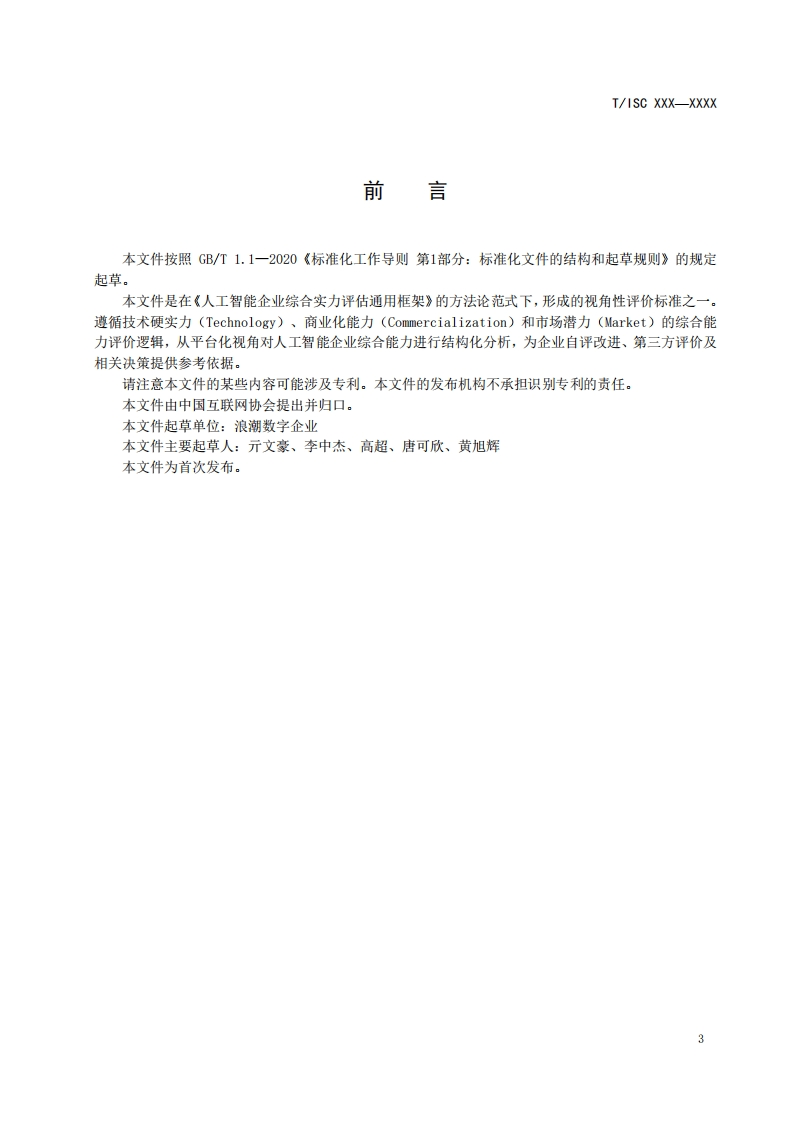 ICS35.x××CCS Lxx团体标准T/ISC XXX-XXXX人工智能企业综合能力评价规范(平台化视角)Specification for Comprehensive Capability Evaluation of Artificial IntelligenceEnterprises (Platform-oriented Perspective)在提交反馈意见时,请将您知道的相关专利与支持性文件一并附上。征求意见稿2025-12-23XXXX-XX-XX发布XXXX-XX-XX实施中国互联网协会发布