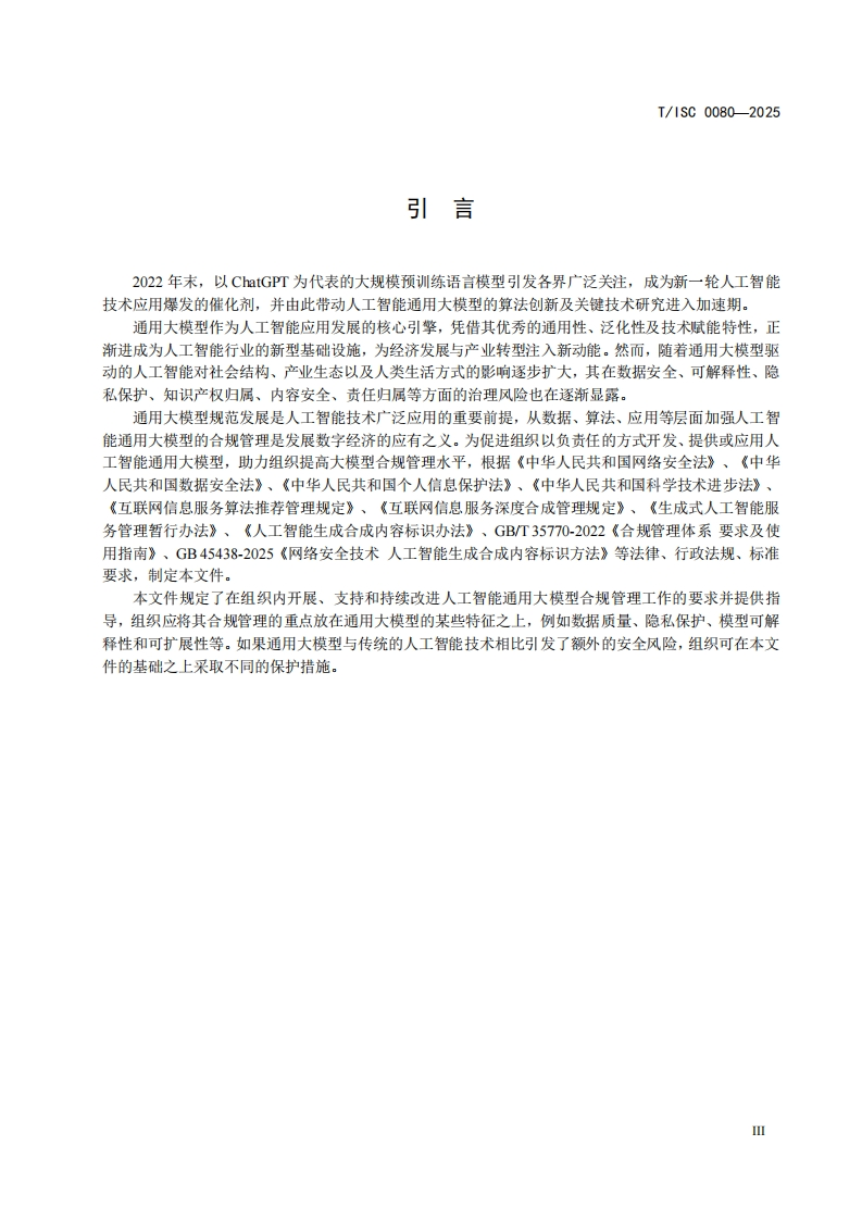 人工智能通用大模型合规管理体系指南Guidelinesforcompliancemanagementforgeneral-purposefoundationalmodelofartificialintelligence348072@abc4天前发布关注私信0.25MB18页043人工智能通用大模型合规管理体系指南Guidelinesforcompliancemanagementforgeneral-purposefoundationalmodelofartificialintelligence此内容为付费资源,请付费后查看¥16¥19黄金会员免费钻石会员免费立即购买您当前未登录!建议登陆后购买,可保存购买订单付费资源 第1页 / 共18页 第2页 / 共18页 第3页 / 共18页 第4页 / 共18页 第5页 / 共18页 试读已结束,还剩13页,您可下载完整版后进行离线阅读 THE END标准规范 文本预览 ICS03.100.01CCS A 02团体标淮T/1SC0080-2025人工智能通用大模型合规管理体系指南Guidelines for compliance management for general-purposefoundational model of artificial intelligence(发布稿)2025-7-18发布2025-8-18实施中国互联网协会发布 查看更多 收起部分 喜欢就支持一下吧收藏