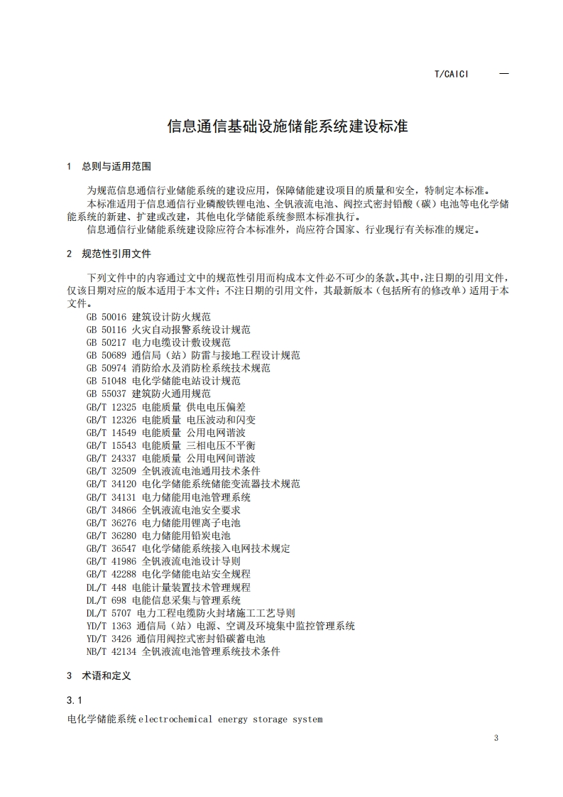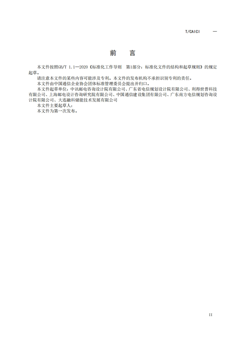ICS点击此处添加ICS号CCS点击此处添加CCS号TCAICI中国通信企业协会团体标准T/CAICI信息通信基础设施储能系统建设标准Construction standards for energy storage systems in information and communicationinfrastructure(征求意见稿)2024.XX.xx在提交反馈意见时,请将您知道的相关专利连同支持性文件一并附上。XXXX-Xx-XX发布XXXX-Xx-X实施中国通信企业协会发布