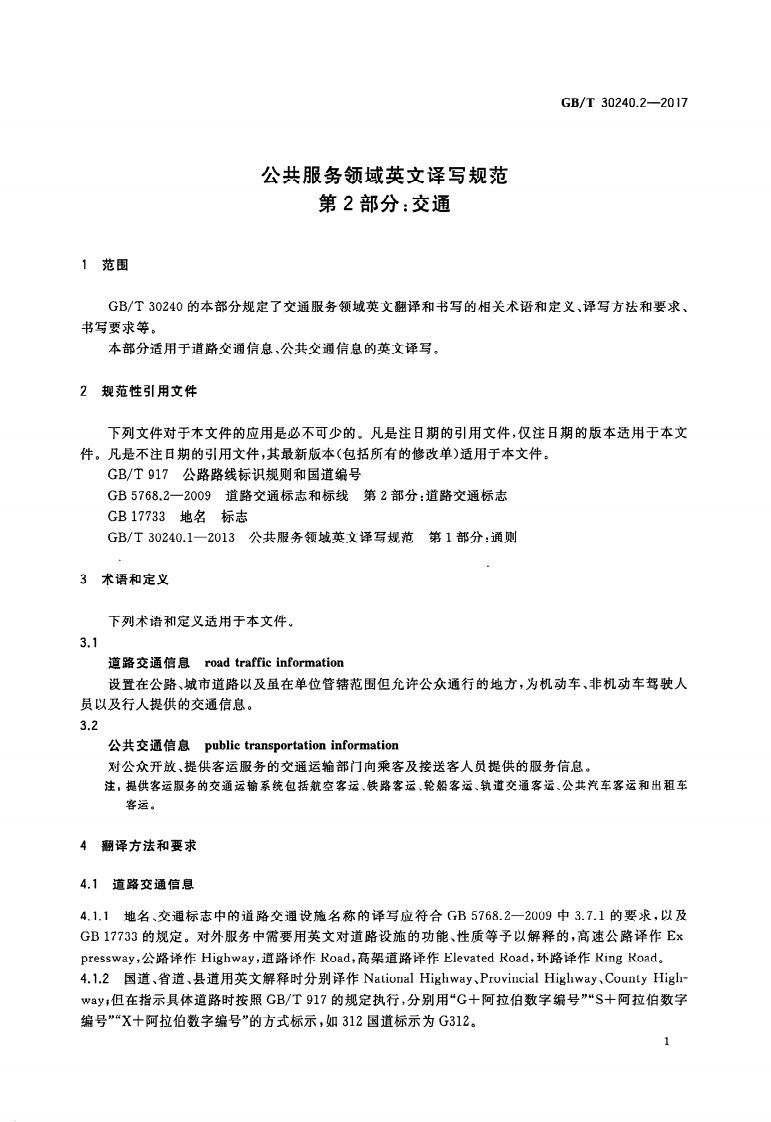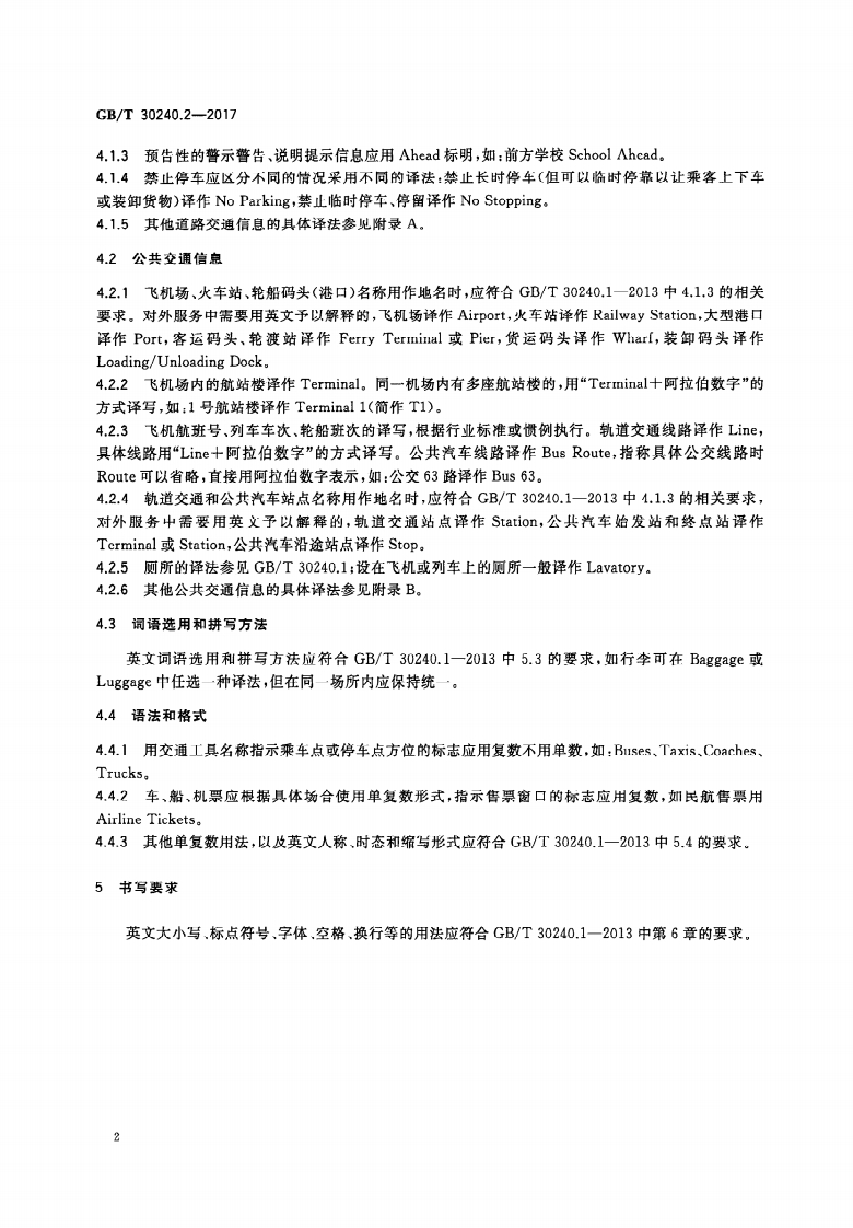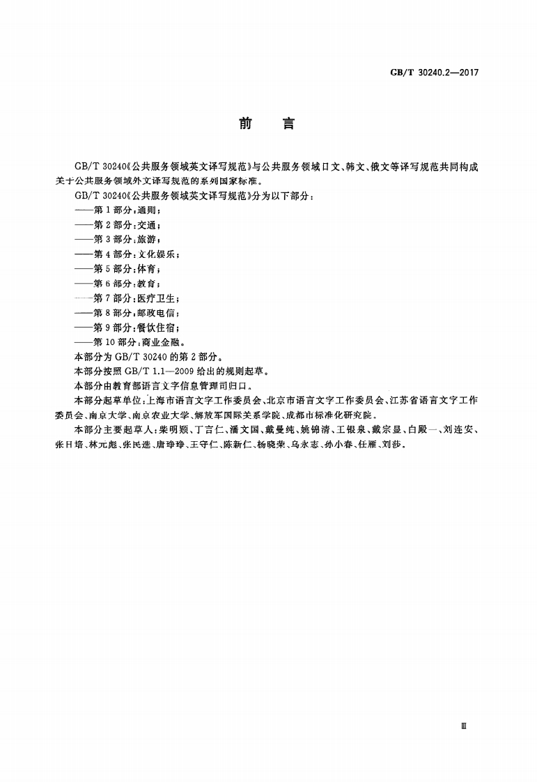 公共服务领域英文译写规范第2部分_交通GuidelinesfortheuseofEnglishinpublicserviceareasPart2_Transportation348072@abc3天前发布关注私信2.19MB28页021公共服务领域英文译写规范第2部分_交通GuidelinesfortheuseofEnglishinpublicserviceareasPart2_Transportation此内容为付费资源,请付费后查看¥16¥19黄金会员免费钻石会员免费立即购买您当前未登录!建议登陆后购买,可保存购买订单付费资源 第1页 / 共28页 第2页 / 共28页 第3页 / 共28页 第4页 / 共28页 第5页 / 共28页 试读已结束,还剩23页,您可下载完整版后进行离线阅读 THE END标准规范 文本预览 ICS01.080.10422GB中华人民共和国国家标准GB/T30240.2一2017公共服务领域英文译写规范第2部分:交通Guidelines for the use of English in public service areas-Part 2:Transportation2017-05-22发布2017-12-01实施中华人民共和国国家质量监督检验检疫总局中国国家标准化管理委员会发布 查看更多 收起部分 喜欢就支持一下吧收藏