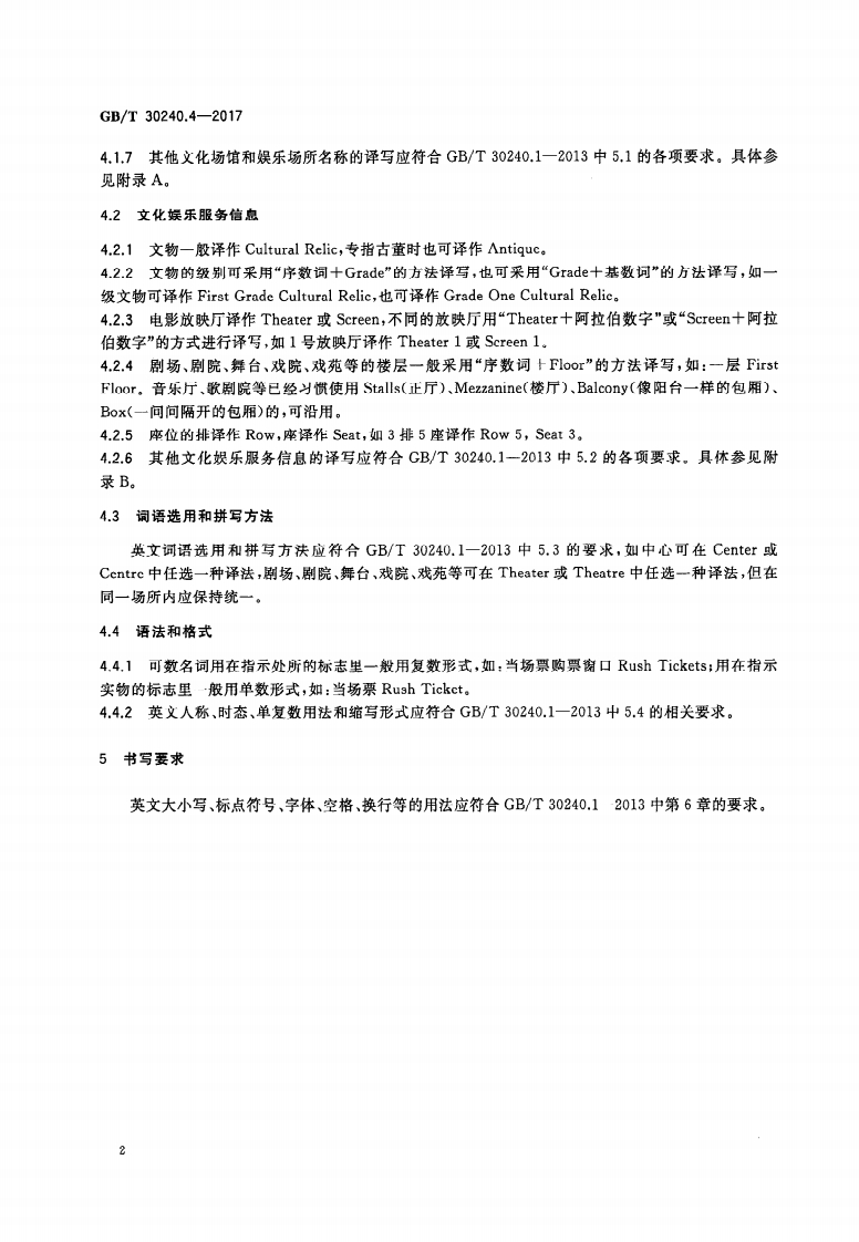 ICS01.080.10A22GB中华人民共和国国家标准GB/T30240.4一2017公共服务领域英文译写规范第4部分:文化娱乐Guidelines for the use of English in public service areas-Part 4:Culture and entertainment2017-05-22发布2017-12-01实施中华人民共和国国家质量监督检验检疫总局巾国国家标准化管理委员会发布