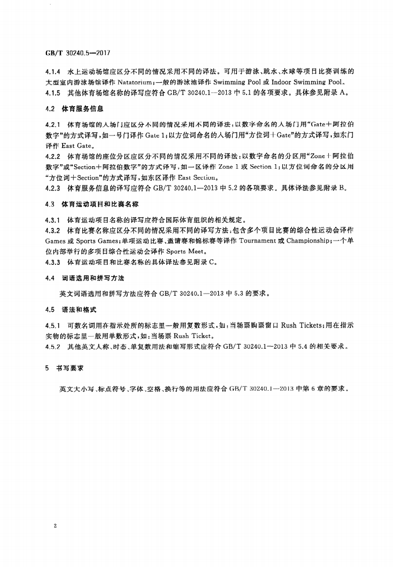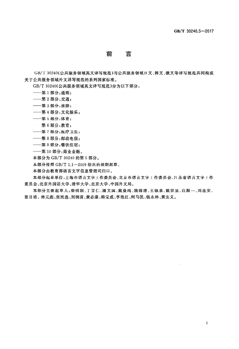 公共服务领域英文译写规范第5部分_体育GuidelinesfortheuseofEnglishinpublicserviceareasPart5_Sports348072@abc3天前发布关注私信1.30MB19页025公共服务领域英文译写规范第5部分_体育GuidelinesfortheuseofEnglishinpublicserviceareasPart5_Sports此内容为付费资源,请付费后查看¥16¥19黄金会员免费钻石会员免费立即购买您当前未登录!建议登陆后购买,可保存购买订单付费资源 第1页 / 共19页 第2页 / 共19页 第3页 / 共19页 第4页 / 共19页 第5页 / 共19页 试读已结束,还剩14页,您可下载完整版后进行离线阅读 THE END标准规范 文本预览 ICS01.080.10Λ22GB中华人民共和国国家标准GB/T30240.5一2017公共服务领域英文译写规范第5部分:体育Guidelines for the use of English in public service areas-Part 5:Sports2017-05-22发布2017-12-01实施中华人民共和国国家质量监督检验检疫总局中国国家标谁化管理委员会发布 查看更多 收起部分 喜欢就支持一下吧收藏
