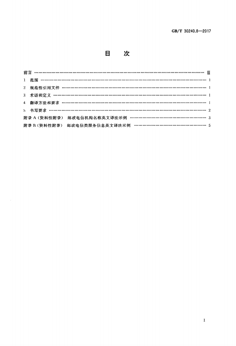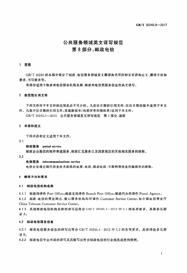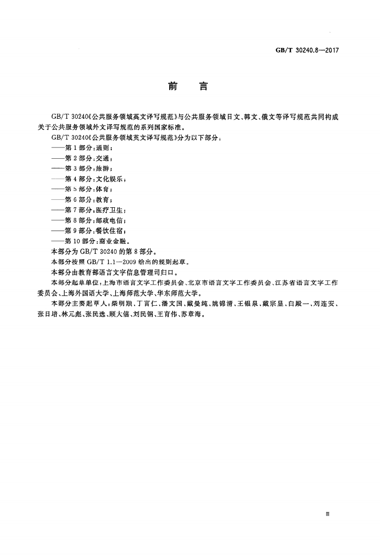 ICS01.080.10A22GB中华人民共和国国家标准GB/T30240.8一2017公共服务领域英文译写规范第8部分:邮政电信Guidelines for the use of English in public service areas-Part 8:Post and telecommunications2017-05-22发布2017-12-01实施中华人民共和国国家质量监督检验检疫总局中国国家标准化管理委员会发布