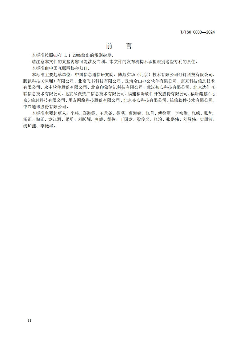 在线协作文档技术规范第3部分_自研Technicalspecificationforonlinecollaborationdocument-Part3_Self-development(发布稿)348072@abc5天前发布关注私信0.27MB9页041在线协作文档技术规范第3部分_自研Technicalspecificationforonlinecollaborationdocument-Part3_Self-development(发布稿)此内容为付费资源,请付费后查看¥16¥19黄金会员免费钻石会员免费立即购买您当前未登录!建议登陆后购买,可保存购买订单付费资源 第1页 / 共9页 第2页 / 共9页 第3页 / 共9页 第4页 / 共9页 第5页 / 共9页 试读已结束,还剩4页,您可下载完整版后进行离线阅读 THE END标准规范 文本预览 ICS35.240L60团体标准T/1SC0038-2024在线协作文档技术规范第3部分:自研Technical specification for online collaboration document-Part 3:Self-development(发布稿)2024-01-29发布2024-02-28实施中国互联网协会发布 查看更多 收起部分 喜欢就支持一下吧收藏