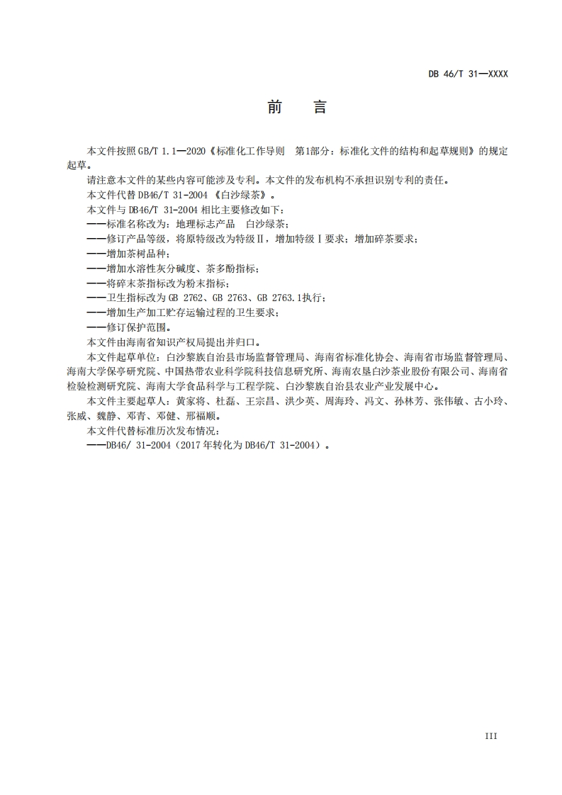 地理标志产品白沙绿茶Productofgeographicalindication-BaishaGreentea348072@abc5天前发布关注私信0.77MB17页023地理标志产品白沙绿茶Productofgeographicalindication-BaishaGreentea此内容为付费资源,请付费后查看¥16¥19黄金会员免费钻石会员免费立即购买您当前未登录!建议登陆后购买,可保存购买订单付费资源 第1页 / 共17页 第2页 / 共17页 第3页 / 共17页 第4页 / 共17页 第5页 / 共17页 试读已结束,还剩12页,您可下载完整版后进行离线阅读 THE END标准规范 文本预览 ICS67.140.10CCS X 550846海南省地方标准DB 46/T 31-XXXX代替DB46/T31-2004地理标志产品白沙绿茶Product of geographical indication-Baisha Green tea(本草案完成时间:2023-12-24)XXXX-XX-XX发布XXX-x-X实施海南省市场监督管理局发布 查看更多 收起部分 喜欢就支持一下吧收藏
