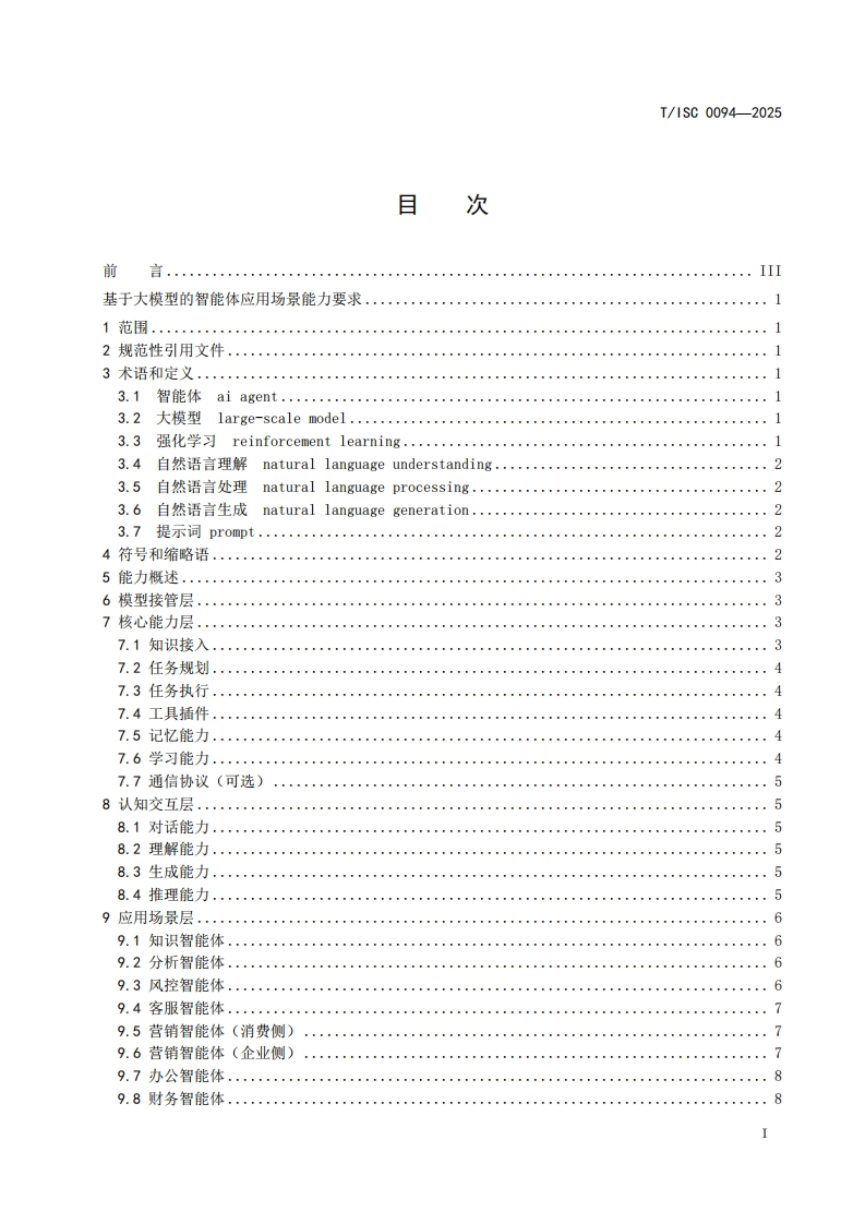 基于大模型的智能体应用场景能力要求Requirementsofartificialintelligentagentapplicationscenariosbasedonlargescalemodel(发布稿)348072@abc6天前发布关注私信0.61MB15页042基于大模型的智能体应用场景能力要求Requirementsofartificialintelligentagentapplicationscenariosbasedonlargescalemodel(发布稿)此内容为付费资源,请付费后查看¥16¥19黄金会员免费钻石会员免费立即购买您当前未登录!建议登陆后购买,可保存购买订单付费资源 第1页 / 共15页 第2页 / 共15页 第3页 / 共15页 第4页 / 共15页 第5页 / 共15页 试读已结束,还剩10页,您可下载完整版后进行离线阅读 THE END标准规范 文本预览 ICS35.210CCS L70团体标准T/ISC0094-2025基于大模型的智能体应用场景能力要求Requirements of artificial intelligent agent application scenarios based on largescale model(发布稿)2025-12-26发布2026-01-26实施中国互联网协会发布 查看更多 收起部分 喜欢就支持一下吧收藏