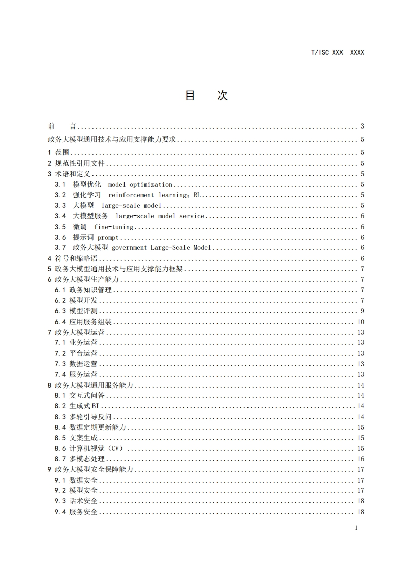 ICS35.240.99CCS L67团体标准T/ISC XXX-XXXX政务大模型通用技术与应用支撑能力要求General technical and application support capability requirements for governmentlarge models在提交反馈意见时,请将您知道的相关专利与支持性文件一并附上。征求意见稿2025-03-28XXXX-XX-XX发布XXXX-XX-XX实施中国互联网协会发布