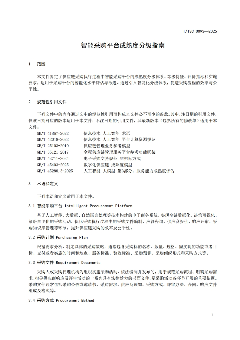 智能采购平台成熟度分级指南MaturityGradingGuideofIntelligentProcurementPlatform(发布稿)_1348072@abc3天前发布关注私信0.33MB13页035智能采购平台成熟度分级指南MaturityGradingGuideofIntelligentProcurementPlatform(发布稿)_1此内容为付费资源,请付费后查看¥16¥19黄金会员免费钻石会员免费立即购买您当前未登录!建议登陆后购买,可保存购买订单付费资源 第1页 / 共13页 第2页 / 共13页 第3页 / 共13页 第4页 / 共13页 第5页 / 共13页 试读已结束,还剩8页,您可下载完整版后进行离线阅读 THE END标准规范 文本预览 ICS35.240CCS L67团体标准T/1SC0093-2025智能采购平台成熟度分级指南Maturity Grading Guide of Intelligent Procurement Platform(发布稿)2025-12-26发布2026-01-26实施中国互联网协会发布 查看更多 收起部分 喜欢就支持一下吧收藏