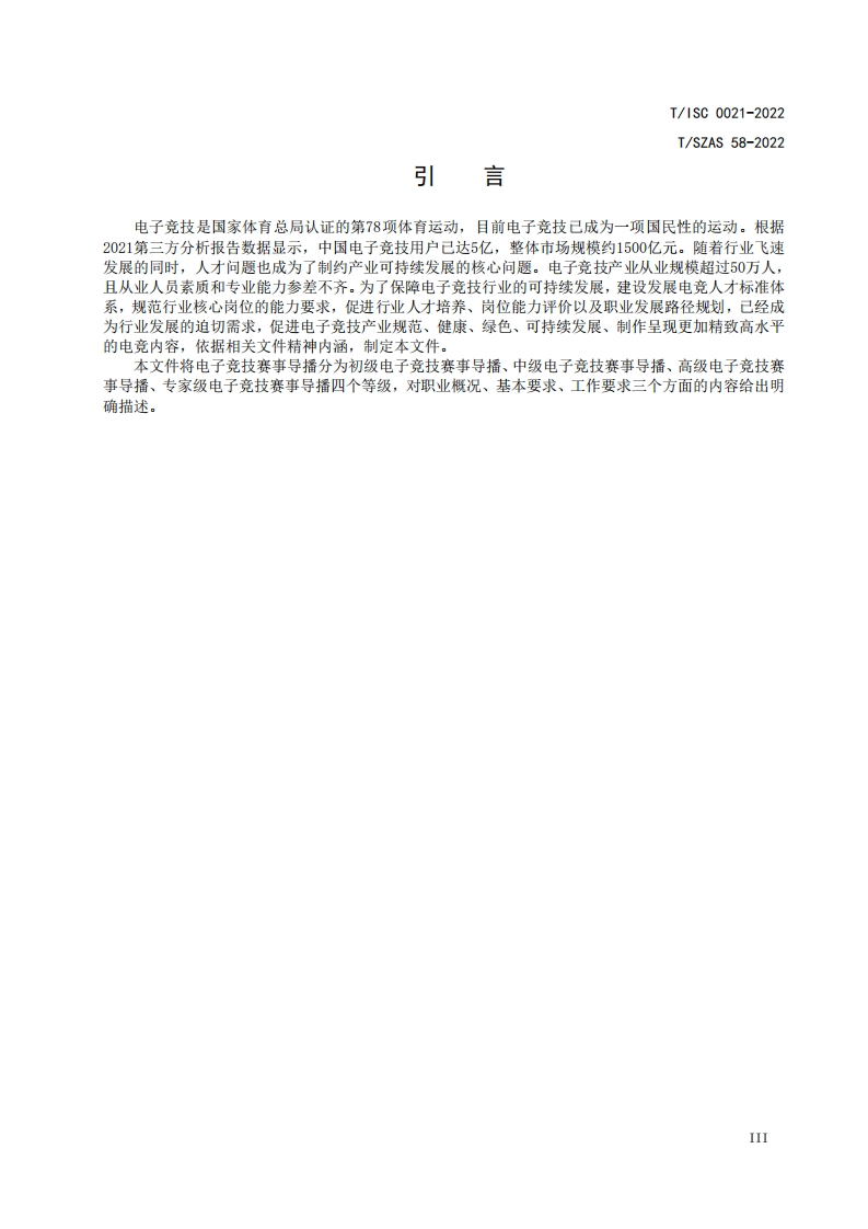 电子竞技赛事导播能力要求AbilityRequirementsofE-sportsProgramDirector348072@abc5天前发布关注私信0.30MB15页027电子竞技赛事导播能力要求AbilityRequirementsofE-sportsProgramDirector此内容为付费资源,请付费后查看¥16¥19黄金会员免费钻石会员免费立即购买您当前未登录!建议登陆后购买,可保存购买订单付费资源 第1页 / 共15页 第2页 / 共15页 第3页 / 共15页 第4页 / 共15页 第5页 / 共15页 试读已结束,还剩10页,您可下载完整版后进行离线阅读 THE END标准规范 文本预览 ICS33.20CCS M32团体标准T/ISC0021-2022T/SZAS58-2022电子竞技赛事导播能力要求Ability Requirements of E-sports Program Director2022-11-01发布2023-02-01实施中国互联网协会深圳市标准化协联合发布 查看更多 收起部分 喜欢就支持一下吧收藏