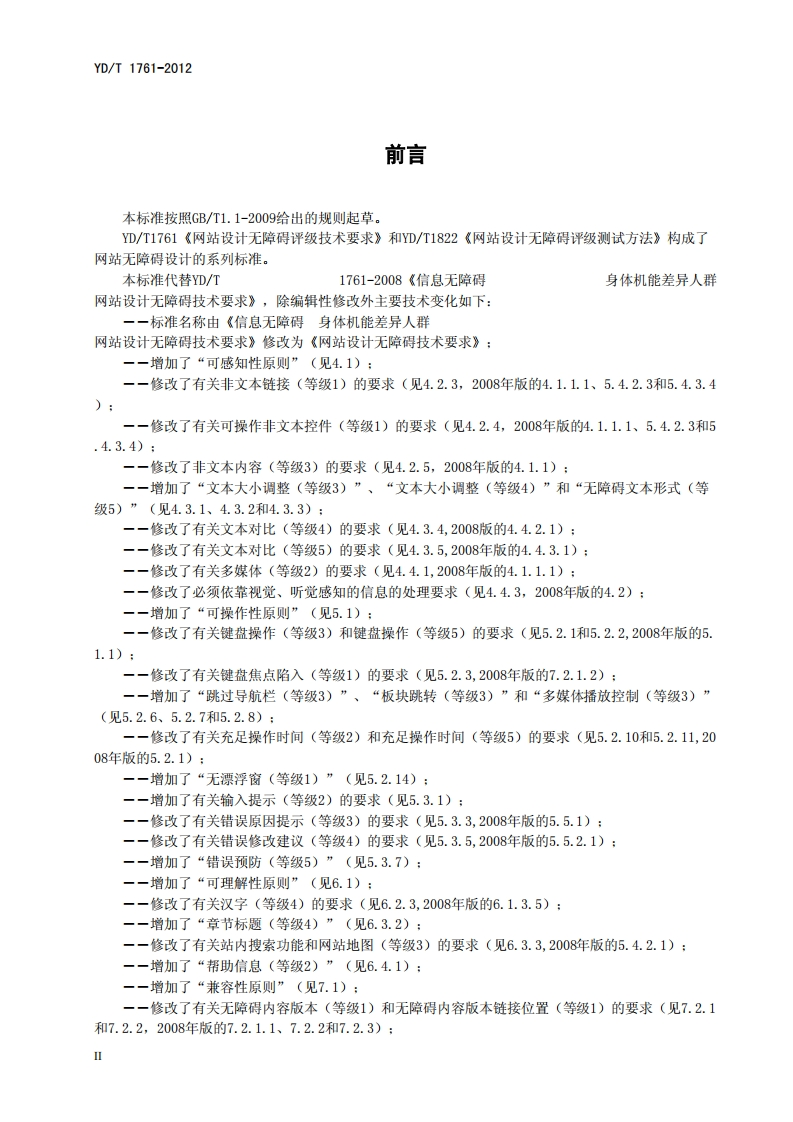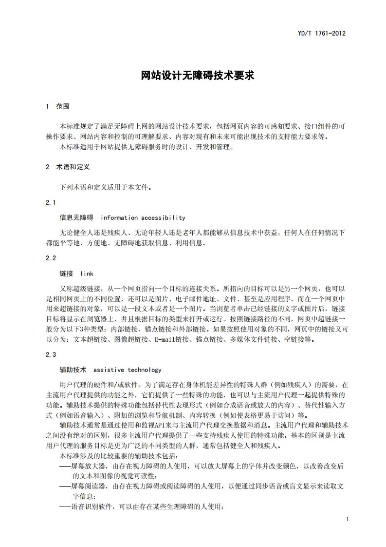 网站设计无障碍技术要求Technicalrequirementsforwebaccessibility_1348072@abc6天前发布关注私信0.24MB15页044网站设计无障碍技术要求Technicalrequirementsforwebaccessibility_1此内容为付费资源,请付费后查看¥16¥19黄金会员免费钻石会员免费立即购买您当前未登录!建议登陆后购买,可保存购买订单付费资源 第1页 / 共15页 第2页 / 共15页 第3页 / 共15页 第4页 / 共15页 第5页 / 共15页 试读已结束,还剩10页,您可下载完整版后进行离线阅读 THE END标准规范 文本预览 ICS33.030M21YD中华人民共和国通信行业标准YD/T1761-2012代替YD/T1761-2008网站设计无障碍技术要求Technical requirements for web accessibility2012-12-28发布2013-03-01实施中华人民共和国工业和信息化都发布 查看更多 收起部分 喜欢就支持一下吧收藏
