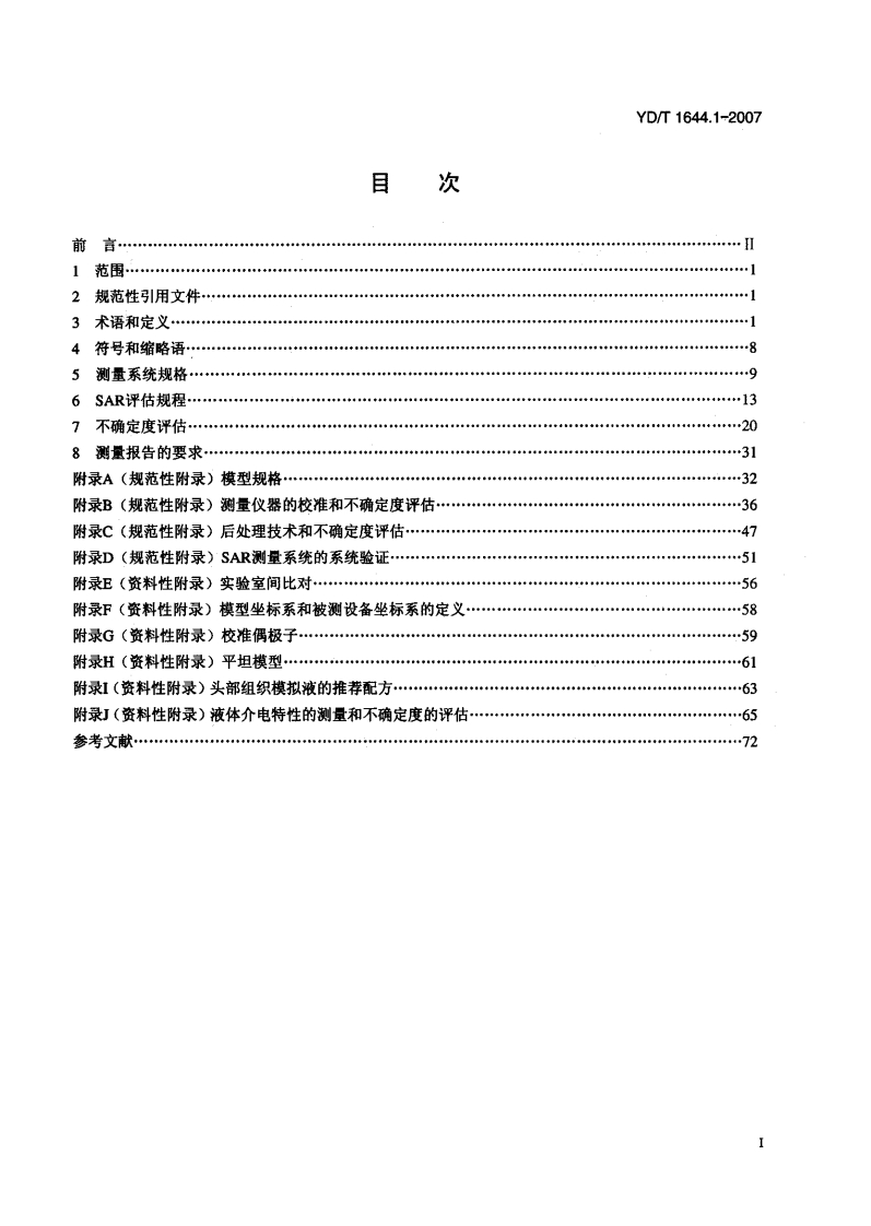 1CS33100M04YD中华人民共和国通信行业标准YD/T1644.1-2007手持和身体佩戴使用的无线通信设备对人体的电磁照射一人体模型、仪器和规程第1部分:靠近耳边使用的手持式无线通信设备的SAR评估规程(频率范围300MHz~3GHz)Human exposure to radio frequency fields from hand-held andbody-mounted wireless communication devices-Human models,instrumentation,and proceduresPart 1:Procedure to determine the specific absorption rate(SAR)forhand-held devices used in close proximity to the ear(frequency rangeof 300 MHz~3 GHz)(IEC 62209-1:2005,Human exposure to radio frequency fields from hand-held andbody-mounted wireless communication devices-Human models,instrumentation,andprocedures-Part 1:Procedure to determine the specific absorption rate(SAR)for hand-helddevices used in close proximity to the ear(frequency range of 300 MHz-3 GHz),IDT)2007-07-20发布2007-12-01实施中华人民共和国信息产业部发布