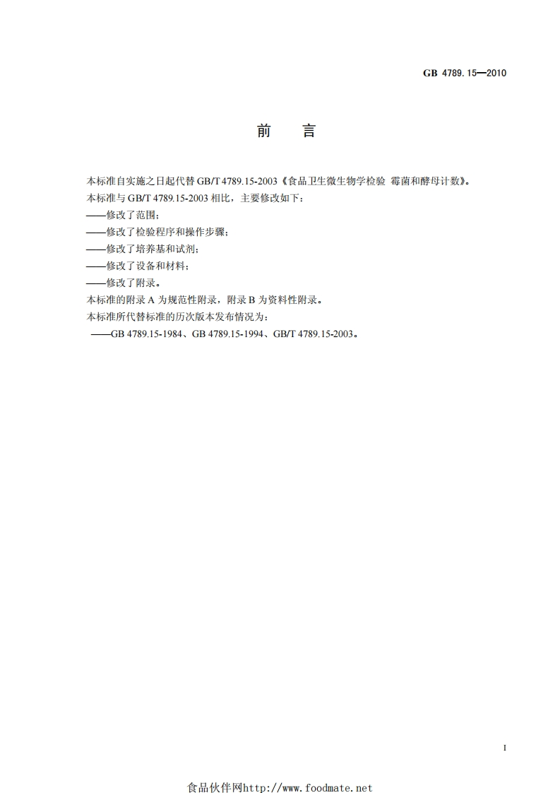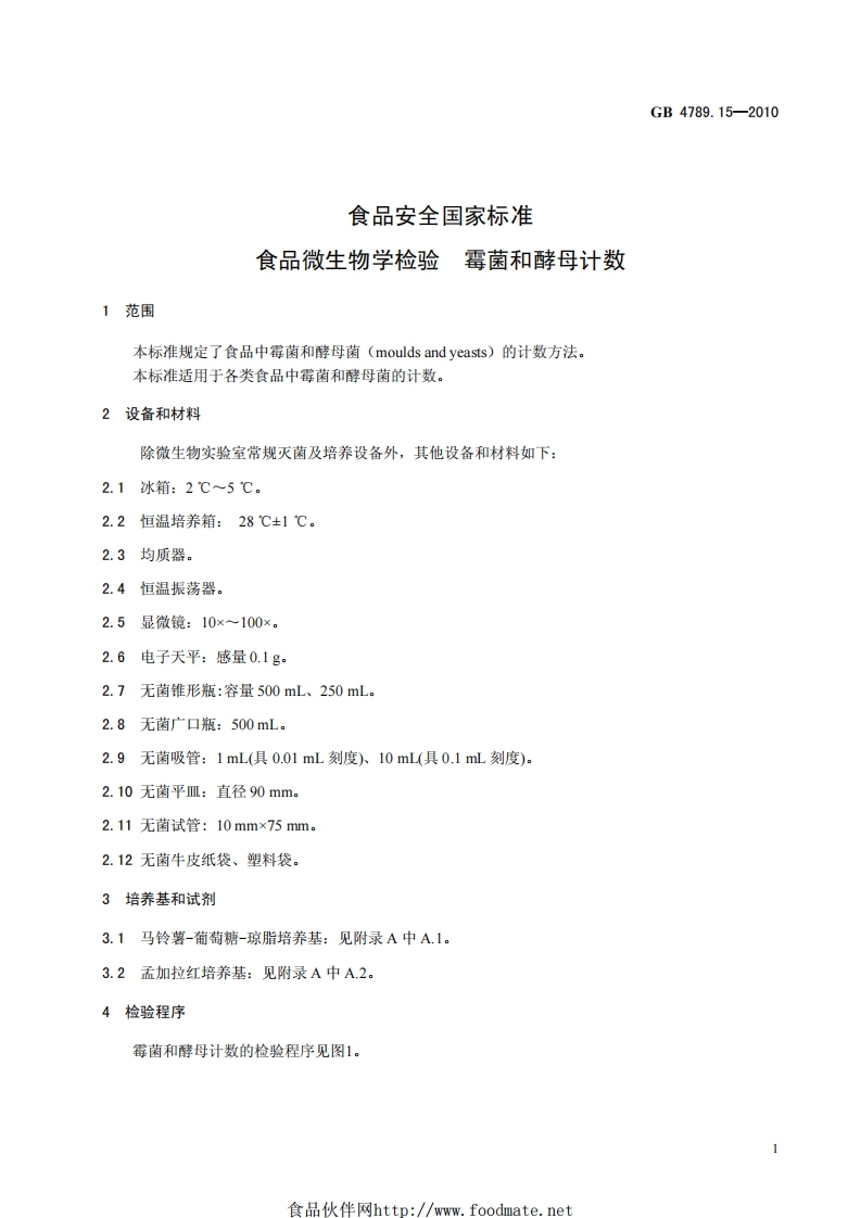 食品安全国家标准食品微生物学检验霉菌和酵母计数NationalfoodsafetystandardFoodmicrobiologicalexamination_Enumerationofmouldsandyeasts348072@abc8天前发布关注私信0.15MB7页034食品安全国家标准食品微生物学检验霉菌和酵母计数NationalfoodsafetystandardFoodmicrobiologicalexamination_Enumerationofmouldsandyeasts此内容为付费资源,请付费后查看¥16¥19黄金会员免费钻石会员免费立即购买您当前未登录!建议登陆后购买,可保存购买订单付费资源 第1页 / 共7页 第2页 / 共7页 第3页 / 共7页 第4页 / 共7页 第5页 / 共7页 试读已结束,还剩2页,您可下载完整版后进行离线阅读 THE END标准规范 文本预览 中华人民共和国国家标准GB4789.15-2010食品安全国家标准食品微生物学检验霉菌和酵母计数National food safety standardFood microbiological examination:Enumeration of moulds and yeasts2010-03-26发布2010-06-01实施中华人民共和国卫生部发布食品伙伴网http:/www.foodmate.net 查看更多 收起部分 喜欢就支持一下吧收藏