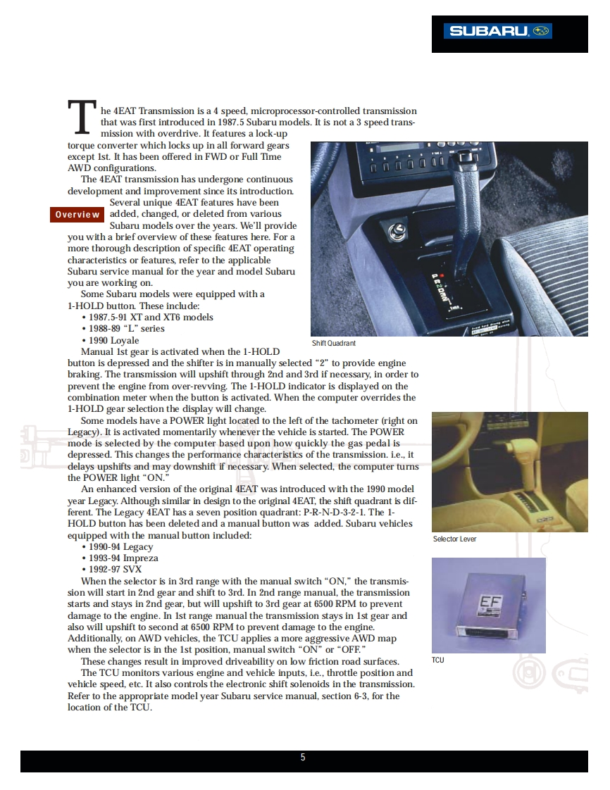 Subar 4EA ransmissionsSubard T Transmissions101OverviewFeatures and Major ComponentsPower FlowFinal Drive FWD/AWDElectronic Control SystemHydraulic Control SystemSelf Diagnostic SystemTroubleshooting/Adjustments4