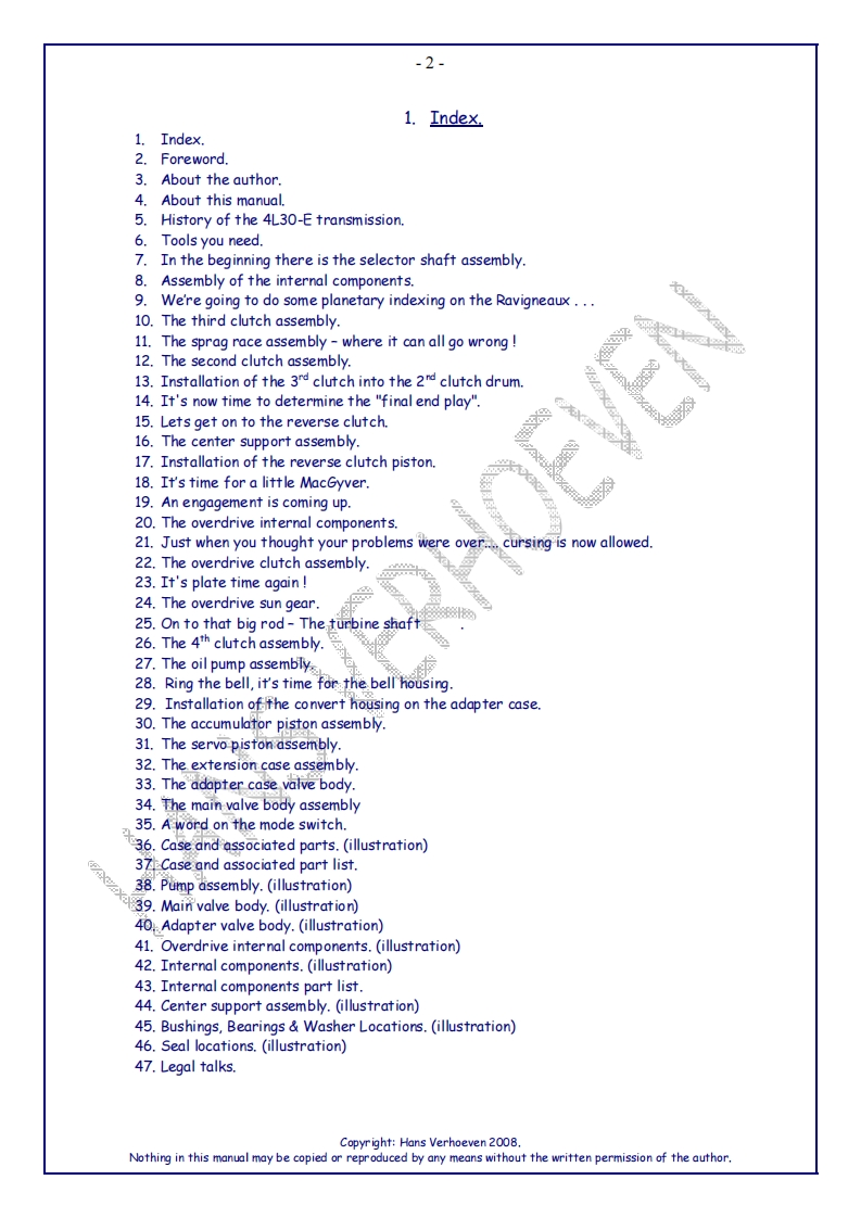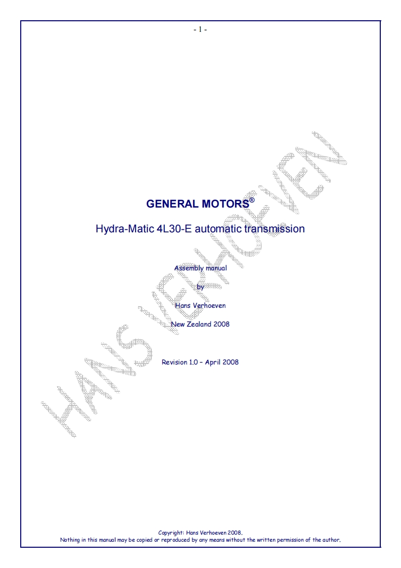 -1-剂GENERAL MOTORSHydra-Matic 4L30-E automatic transmissionAssembly manualHans Verhoeven>入⊙aJ2w乙Z2a1aw山2○○BRevision 1.0-April 2008Copyr ight:Hans Verhoeven 2008.Nothing in this manual may be copied or reproduced by any means without the written permission of the author.