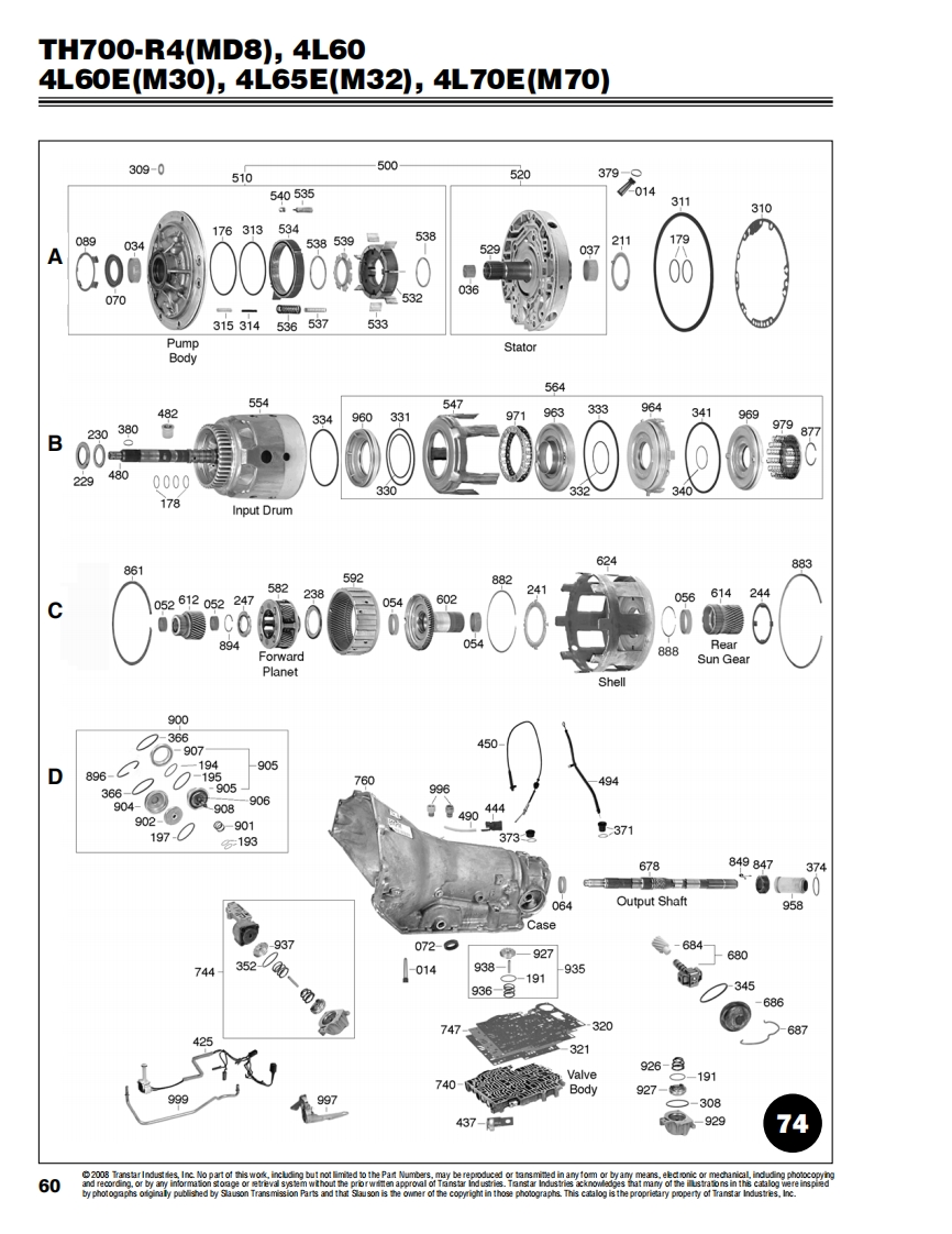 TH700-R4MD8),4L604L60E(M30),4L65E(M32),4L70E(M70)309-05005105203795405353113101763135340890345290370000660036070532533PumpStatorBody5645544823339643496B23000-22480000066正0600068178Input Drum6248618835925820526120522472386614244CC00894Forward888RearSun GearPlanetShell90036645002路-194905D896760494366905996906902-⊙@9080自490444197-0-901373粤371分1936788498474000064Output Shaft958Case0a0-937072-⊙》—9271684680744352014938-935→-191936-7-345686747320687425321u926-BValve191740-Body927999997308437--9297460by photogaphs ofginaly published by Slauson Transmission Parts and thatSlauson is the owner of the copyright in those photographs.This catalog is the proprietary poperty of Transtar Industres,Inc.