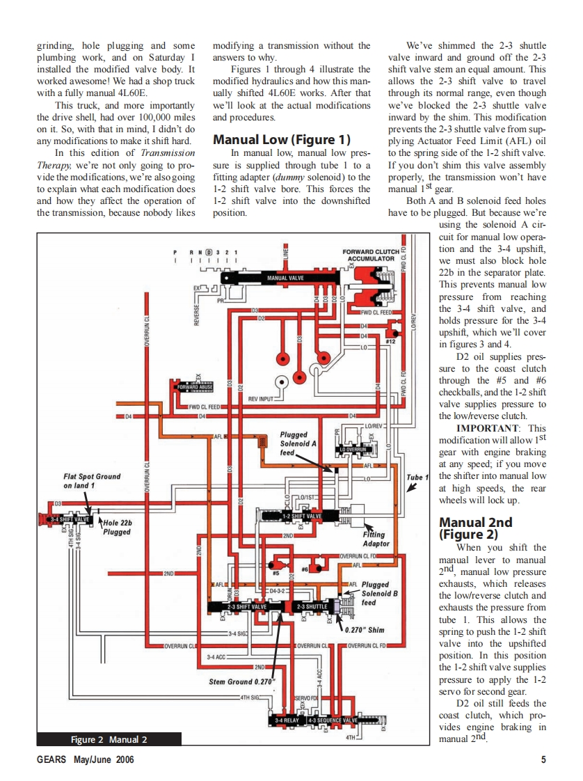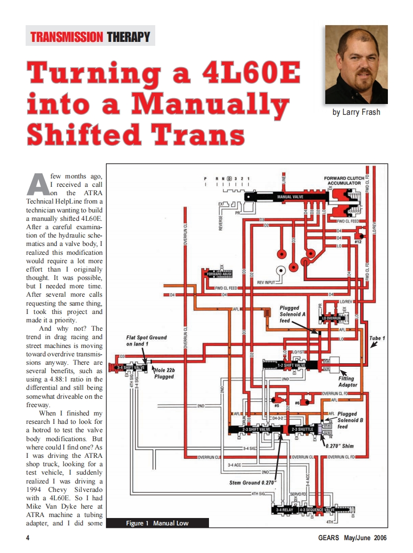TRANSMISSION THERAPYTurning a 4L60Einto a Manuallyby Larry FrashShifted Transfew months ago,FORWARD CLUTCHI received a callACCUMULATORonthe ATRAMANUAL VALVETechnical HelpLine from atechnician wanting to builda manually shifted 4L60E.FWD CL FEEDAfter a careful examina-tion of the hydraulic sche-matics and a valve body,Irealized this modificationwould require a lot moreeffort than I originallythought.It was possible,REV INPUTbut I needed more time.FWD CL FEEDAfter several more callsrequesting the same thing,I took this project andPluggedSolenoid Amade it a priority.feedAnd why not?Thetrend in drag racing andFlat Spot Groundstreet machines is movingon land 1toward overdrive transmis-sions anyway.There areSHIFT VALVseveral benefits,such asHole 22busing a 4.88:1 ratio in thePluggedFittingdifferential and still beingAdaptorOVERRUN CL FOsomewhat driveable on theAFLfreeway.2N0When I finished myAFLPluggedresearch I had to look for0432Solenoid B-3 SHUTTLEfeeda hotrod to test the valvebody modifications.Butwhere could I find one?As0.270"shimI was driving the ATRAOVERRUN CLLOVERRUN CL FDshop truck,looking for a4 ACCtest vehicle,I suddenlyrealized I was driving aStem Ground 0.2701994 Chevy Silverado4TH SIGwith a 4L60E.So I hadMike Van Dyke here atATRA machine a tubingadapter,and I did someFigure 1 Manual Low4GEARS May/June 2006