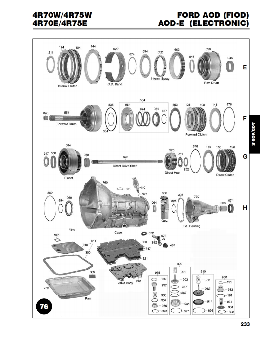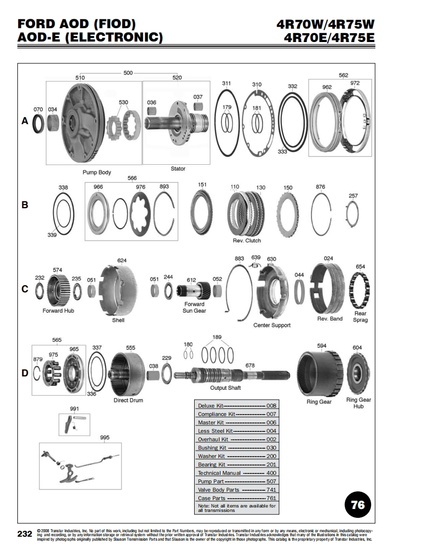 FORD AOD(FIOD)4R70W/4R75WAOD-E(ELECTRONIC)4R70E/4R75E50051052056231203753003607003460000StatorPump Body56696697689315110150876B0000000000Rev.Clutch62488363963002457454232235051051244612Forward0010Forward HubSun GearShellRev.BandSpragCenter Support18956596533755518059460497587922900038678DOutput ShaftDirect DrumRing GearRing GearDeluxe Kit-.-008991HubCompliance Kit--007Master Kit-----006Less Steel Kit----004995Overhaul Kit--002Bushing Kit-030Washer Kit----200Bearing Kit----------201Technical Manual=--400Pump Part-507Valve Body Parts --------741Case Parts---76176232inspired by photog aphs ofginaly published by Slauson Tansmission Partsand that Slauson is the owner of the copyright in those photographs.This catalbg is the proprietary property of Transtar Industries,Ine.