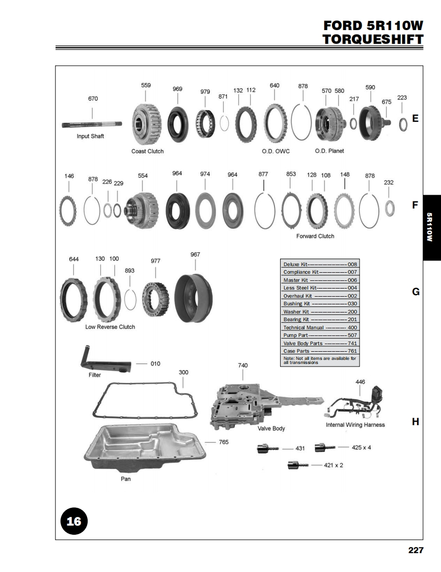 FORD 5R110WTORQUESHIFT311510544520960971120100140860530070A00000Pump BodyStatorO.D.brake860630962124104144555972874965975965879126106225B0000000●0000Center SupportIntermediate ClutchDirect Clutch622892231681602592235584582594604699238243247250C0000000月Forward PlanetRear PlanetSun Gear Shell760770690263678DOutput ShaftCase16226inspired by photog aphs ofginaly published by Slauson Tansmission Parts and that Slauson is the owner of the copyright in those photographs.This catalbg is the proprietary property of Transtar Industries,Ine.