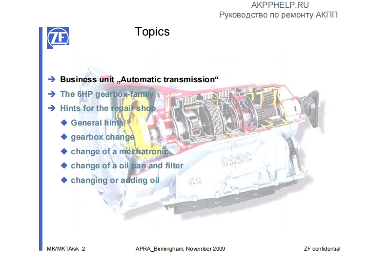 AKPPHELP.RUPyKoBOACTBo no peMoHTy AKnn12/13th November 2009European MechatronicsDriveline and Chassis Technologyand Automatic TransmissionWorkshopZF TransmissionsBirmingham(UK)with MechatronicsHans-Peter Bach,Director Serivce (hans-peter.bach@zf.com)ZF Getriebe GmbH,Business Unit Automatic Transmissions