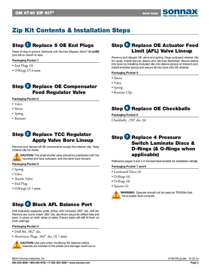 sonnaxZIPGM6T40(GEN.1),6T45(GEN.1)KIT6T50(GEN.1)ZIP KIT®PART NUMBER 6T40-ZIPQUICK GUIDEParts are labeled here in order of installation.See other side of sheet for details on Zip Kit contents.INSTALLATION DIAGRAMNOTE:All components of this kitinstall into the mechatronic unit,and not the pump.Removal of/NOTEControlthe pump is not required forthis kit,unless vacuum testing is toValve Bodybe performed.WWWM6●Plastic CheckballsMWw30三H=e=MOBlock AFL BalanceWARNING:Spacers should4】Port by drilling andnot be used on TEHCMs thatplugging separator platewa have plastic fluid conduits.where indicated using drillbit and aluminum plugNOTE:Reference pages 3 and 4 in theprovided (not shown).Solenoidtechnical booklet for installation detailsValve BodyIn addition to general rebuilding tips and technical information,the technical booklet included in this kit contains vacuumtesting and additional repair options for higher mileage units or for repairing specific complaints which are beyond thescope of this kit.2014 Sonnax Industries,Inc.6T40-Z1P_Guide12-23-14800-843-2600·802-463-9722·F:802-463-4059·ww.50nnax.c0mPage 1