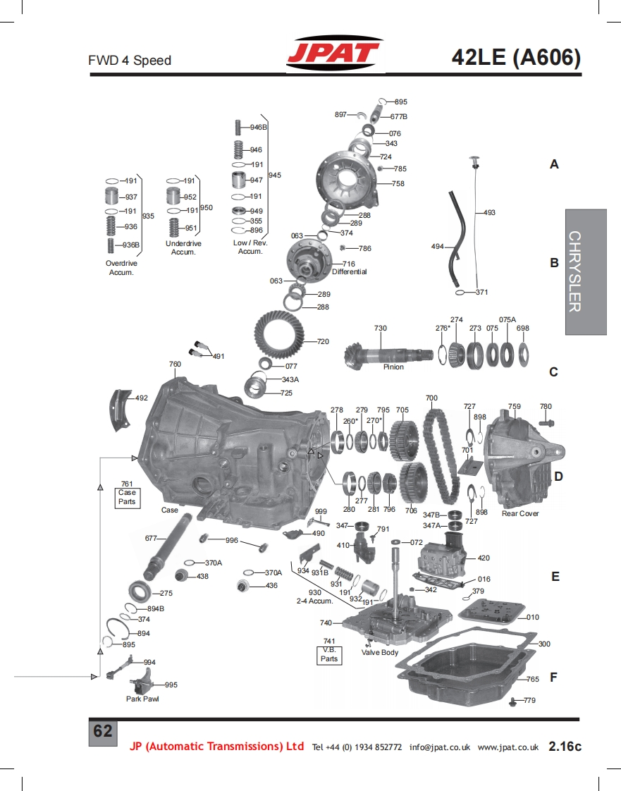 42LE(A606)PATFWD 4 Speed50007051052018131067005057488003453017747A00Input Shaft5400-378Input ClutchHob560564331862971330961331554341875980970960877232334A4843348340BO.Dr./Rev.Input ClutchPistonRetainer120100876142*86010012014089110012015089222022100000Underdrive HubUe花reReverseClutchClutch583052570052214578882582882594238614241584251252213*0390390580Rear SunO.Dr.Hub2-4 HubFrontRing GearGearRear PlanetwSun GearPlanet56863096833233978124104863154885*11400000C的Low/Reverse Clutch567338339957329693967:0000000622.16b JP (Automatic Transmissions)Ltd Tel+44 (0)1934 852772 info@jpat.co.uk www.jpat.co.uk