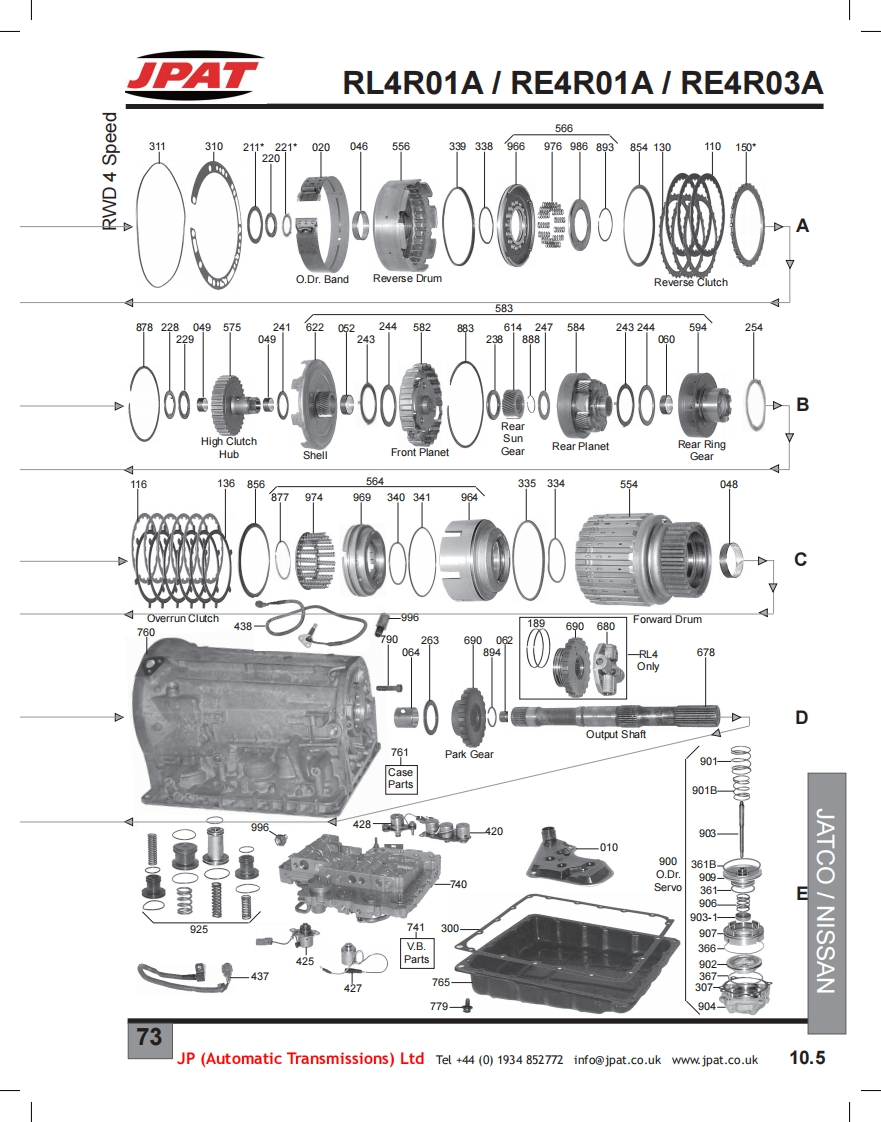 RL4R01A/RE4R01A/RE4R03APAT10500535315089070034510533532176314314520179180037RWD5385383130365405354 Speed00536778537776Pump BodyStator565312555331330965975985879147106126146892380670Input Shaft00@00High DrumHigh Clutch5748816588125457987614810812885387015600000Forward SpragForward HubOverrun HubForward Clutch23588965828689088515411413485726018166856733233332987977967-000000000RearSupportLow /Reverse Clutch781-99230577006607445NVSSINE9910-072Ext.Housing995-370Park Pawl.436Linkage7310.4JP (Automatic Transmissions)Ltd Tel +44 (0)1934 852772 info@jpat.co.uk www.jpat.co.uk