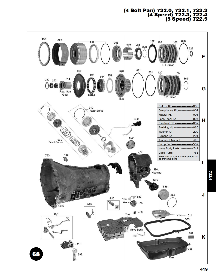 722.0,722.1,722.2(4 Bolt Pan)722.3.722.4(4 Speed)722.5(5 Speed)50052031151054496685413011097698607003411006A893210Body GearB-3 ClutchStator88658262422967024241584B00Input ShaftRear PlanetForward PlanetShell5500269619819716@600C000257634K-2 DrumBandBS Clutch00000000c00013611656KS DrumKS Clutch59088958061021621767884784927227189272844798E0060O.D.SunOutput269GearShaft0.DPlanetRing Gear68418