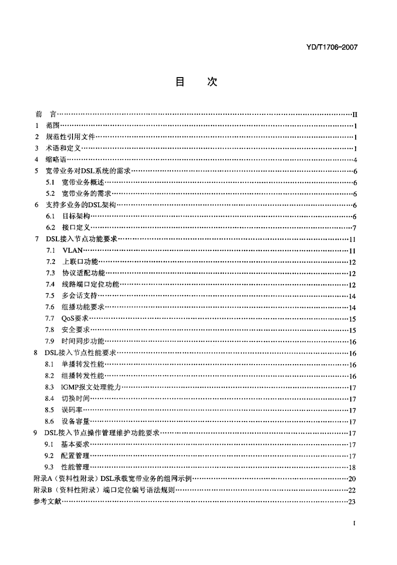 YD-T1706-2007348072@abc4个月前发布关注私信1.22MB26页028YD-T1706-2007此内容为付费资源,请付费后查看¥17¥23黄金会员免费钻石会员免费立即购买您当前未登录!建议登陆后购买,可保存购买订单付费资源 第1页 / 共26页 第2页 / 共26页 试读已结束,还剩24页,您可下载完整版后进行离线阅读 THE END标准规范 文本预览 CS3304050M19YD中华人民共和国通信行业标准YDT1706-2007接入网技术要求数字用户线(DSL)系统承载宽带业务Technical Requirements for Access Network-Broadband Service Delivery over DSL2007-09-29发布2008-01-01实施中华人民共和国信息产业部发布 查看更多 收起部分 喜欢就支持一下吧收藏