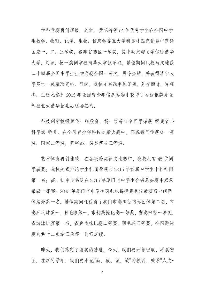 2015-2016学年第一学期开学式校长讲话老师、同学们:“残云收夏暑,新雨带秋岚。”在这个层林尽染、丹桂飘香的美好季节,带着对暑假生活的美好记忆、怀着对新学期的憧憬向往,我们欢聚一堂,在这里隆重举行福建省厦门第一中学2015一2016学年度开学典礼。在这激动人心的时刻,我谨代表学校,向本学期刚刚加入我们这个大家庭的11名新教师和高一21个班、初一16个班共1749多名新同学表示热烈的欢迎!对上个学年在各个方面取得优异成绩的教职员工和同学们表示衷心地祝贺!预祝老师们身体健康,工作顺利;同学们学业有成,万事如意!过去的一个学年里,一中人同心相携,克难攻坚,一心一意谋发展,聚精会神抓质量,取得了可喜的成绩,收获了丰硕的成果:中考方面,全市前100名,我校31人;高考方面,2015年高考我校本一率达95.15%,再创辉煌!高分段人数再次位居全省第一!福建省理科前100名,我校15人,其中前50名有11人,超过全省的五分之一;文科前50名,我校10人,其中前20名有4人,占全省的五分之一。共有25人被清华、北大录取,全省最多;港大、香港科技大学、香港中文大学共录取我校学生15人;2015届中美班毕业生100%被国外优秀大学录取,73%被美国排名前100的大学录取,27%被加拿大、澳大利亚、日本、法国排名前25的大学录取,平均每位学生获得两至三份世界知名学府录取通知书。其中孙睿同学同时接到10所世界著名学府的录取通知书。