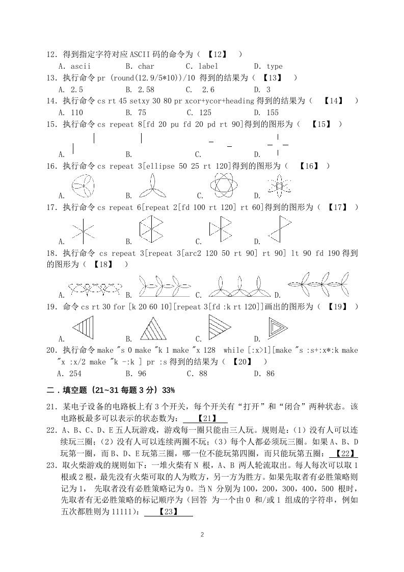 2021年厦门市小学生计算机L0G0语言竞赛(初赛)试卷参赛须知1、本竞赛用时为90分钟。2、答案依【】框中所示标号填写在答题卷上,考试结束时只交答题卷。3、需要画图时可用铅笔和规尺,图形要求形状和比例基本相似即可。一.选择题(1-10每题1分,11-20每题2分)30%1.计算机标准键盘英文字母第二排的排列顺序为ASD_GHKL:(【1】)。A.TJB.FJ C.EFD.R U2.条形码扫描仪属于计算机的哪一种设备(【2】)。A.输入设备B.输出设备C.处理器D.打印设备3.与二进制数11010111对应的十进制数是(【3】)。A.123B.125C.213D.2154.已知“A”的ASCII码值的十进制数是65,则“D”的ASCII码值的十进制数是(【4】)。A.66B.67C.68D.695.家用扫地机器人具有自动避障、自动清扫等功能,这主要体现了(【5】)。A.网络技术B.人工智能技术C.多媒体技术D.数据管理技术6.下列可以直接被计算机执行的程序设计语言是(【6】)。A.汇编语言B.高级语言C.机器语言D.自然语言7.题图为计算机硬件系统的组成与工作原理,其中①、②处的硬件名称分别是(【7】)。箱输入改各存储器辑出设奋→姁赶流CPU控流题图A.显示器、计算器B.计算器、编辑器C.编辑器、显示器D.运算器、控制器8.某同学从网上下载一篇文章,将作者名字改为自己的名字后上交给老师。这种行为属于(【8】)。A.侵犯他人著作权B.可减轻学习负担C.节省做作业时间D.可以有相同观点9.下列不属于操作系统的是(【9】)。A.androidB.iosC.wpsD.windows10.乘坐高铁时通过人脸识别获得乘车人员信息。这个过程属于(【10】)。A.数据加密B.数据整理C.数据压缩D.数据采集11.设置海龟方向的L0G0命令为(【11】)A.posB.sethC.setxD.sety
