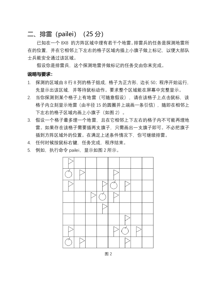 2023厦门市小学生L0G0语言复赛试题学校:姓名:成绩:注意事项:1、竞赛时间为120分钟,若选手只做出试题的部分过程,测试时仍可能得分;2、每位同学以自己的座位号在E盘根目录下建立一个文件夹,并将自己的程序存放在对应的文件夹下。如考号为A01的同学建立的文件夹为E:A01;3、主过程名以题目旁所示名称命名,每道题可单独存盘,文件名分别为:dongche、pailei..lgo、hrt.lgo、fmcz.lgo;4、请选择你用的L0G0语言版本(打勾):FMSLog08.3 MSWLogo6.5一、去台北的动车(dongche)(20分)“坐上那动车去台湾,就在那2035年,去看看那情歌阿里山,还有那神奇的日月潭…”这首网红歌曲,代表着我们多少少年的心声!让我们用LOG0语言编程这一神奇的“画笔”,画一列去合北的动车(如图1),表达我们期盼台湾回归,祖国早日统一的美好愿望!说明与要求:1.车身总长760,20个车窗排列总长约600,车窗为20x20的正方形,间距10车箱高度60,车轮半径10,因此车身总高度为70,车头最前端也是半径为10的半圆弧。2.车轮下画一条长度超过车身总长的直线代表铁轨,线宽为2。3.车身中段显示“BEIJING-TAIBEI"字样。4.其他部位和尺寸请参考图例由你自己决定。5.例如,执行命令dongche,显示如图1所示。▣口口口▣▣口口口口口口口▣口口口▣口口了了1BEIJING-TAIBE图1
