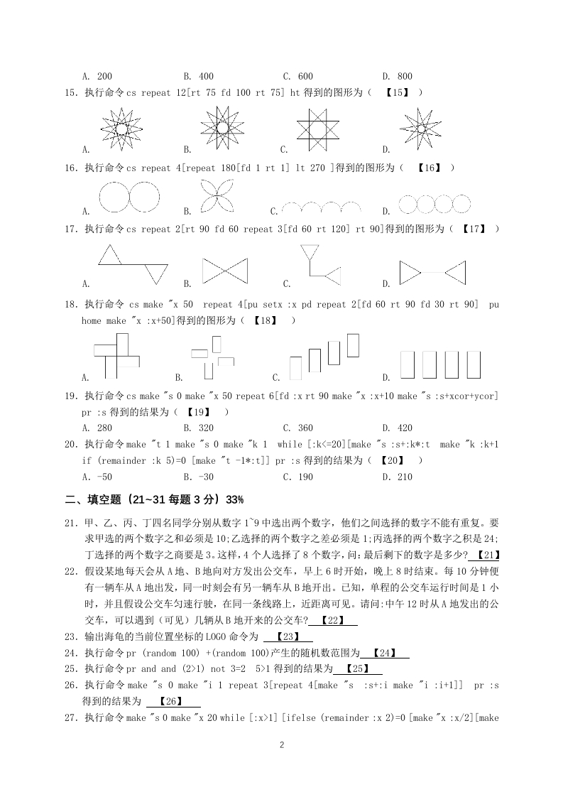 2024年厦门市小学生计算机L0G0语言竞赛(初赛)试卷参赛须知1、本竞赛用时为90分钟。2、答案依【】框中所示标号填写在答题卷上,考试结束时只交答题卷。3、1需要画图时可用铅笔和规尺,图形要求形状和比例基本相似即可。一、选择题(1-~10每题1分,11~20每题2分)30%1.计算机键盘上英文字符第一排的排列顺序依次为:Q W E R TY(【1】)I0PA.KB.GC.UD.X2.以下不属于计算机输出设备的有(【2】A.音箱B.麦克风C.打印机D.显示器3.存储容量1GB等价于(【3】)A.1024PBB.1024KBC.1024BD.1024TB4.在计算机中,cache代表的是(【4】)A.只读存储器B.U盘存储器C.随机存储器D.高速缓存器5.两个二进制数相减101001-10011,值的二进制是多少(【5】A.10110B.00110C.10010D.101006.下列系统中,属于国产操作系统的是(【6】)A.安卓系统B.窗口系统C.苹果系统D.鸿蒙系统7.下列应用中,体现了人工智能技术的有(【7】)①机器人通过语音与人交流②饮水机根据水温自动加热③宾馆通过专用系统进行人脸识别,核实住宿人员身份④利用计算机计算三角形面积⑤停车管理系统通过拍摄识别车牌号码。A.①②③B.①③⑤C.②④⑤D.③④⑤8.协处理器在人工智能大模型训练中获得广泛应用,协处理器的英文缩写为(【8】)A.GPUB.CPUC.AMDD.RAM9.网络时代网络安全尤为重要,下列属于保障计算机网络安全的物理技术措施是(【9】)A.数字认证B.数据加密C.防雷击D.设置密码10.小红用数字1表示字母A,用数字2表示字母B,以此类推,用26表示字母Z。对于27以上的数字,可以用两位或者更长的字符串来对应,例如AA对应27,AB对应28,AZ对应52,AAA对应703,…那么BYV字符串对应的数字是什么?(【10】)A.2018B.2020C.2024D.202811.执行L0G0命令pr round8.49得到的结果为(【11】A.8B.8.4C.8.5D.912.在图形窗口上显示文字“he11o”的L0G0命令为(【12】)A.pr "helloB.Type "helloC.Show "helloD.label "hello13.执行命令pr(ascii"Z)-(ascii"A)得到的结果为(【l3】)A.25B.26C.65D.9014.执行命令cs repeat8[fd50bk50rt45]home,海龟从原点出发,总共走了多少步(【14】)