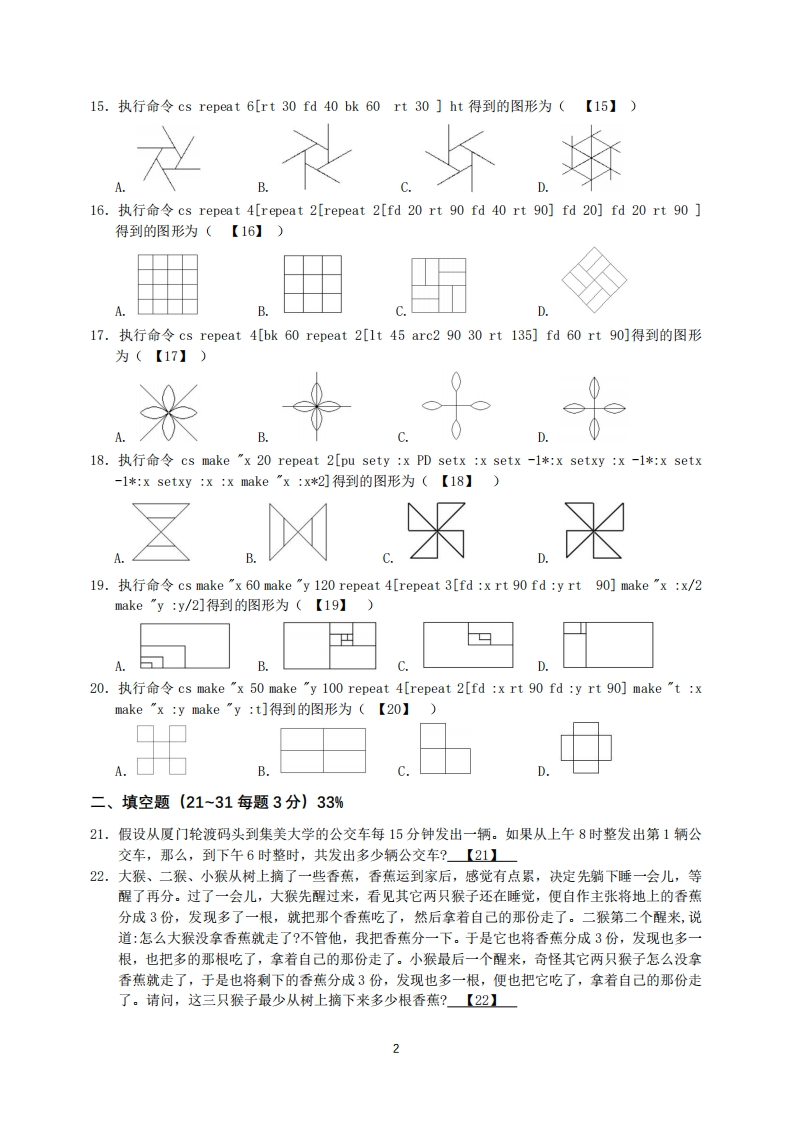 2025年厦门市小学生计算机L0G0语言竞赛(初赛)试卷参赛须知1、本竞赛用时为90分钟。2、答案依【】框中所示标号填写在答题卷上,考试结束时只交答题卷。3、需要画图时可用铅笔和规尺,图形要求形状和比例基本相似即可。一、选择题(1~10每题1分,11~20每题2分)30%1.可以携带进L0G0语言第二轮上机测试现场的物品是(【1】)A.可以发出巨大响声的发光机械键盘B.《L0G0语言程序设计》教材C.印有L0G0语言字样的文化衫T恤D.具有拍照功能的尺子2.考虑右图所示的数字电路,有关逻辑门的含义己在图中标出。高电平表示true,低电平表示false。当x,y,z的输入依次为低电平、高电平、高电平时,输出为(【2】)A.高电平B.低电平C.电路故障D.不确定z3.以下器材断电之后仍能保存数据的有(【3】)A.寄存器B.高速缓存C.RAMD.ROM4.存储容量1TB等于(【4】)A.2°BB.2BC.2"BD.2"B5.在计算机系统中,防火墙的作用是(【5】)A.防止火灾蔓延B.防止网络攻击C.防止计算机死机D.防止使用者误删数据6.在以下不同进制数中,与十进制数251等值的数是多少(【6】)A.11111001aB.3313C.373D.F9a7.在计算机网络中,LAN的含义是(【7】)A.因特网B.局域网C.广域网D.城域网8.某个MW是一段时长4分钟的视频文件。它每秒播放10帧图像,每帧图像是一幅分辨率为2048×1152像素(长宽比16:9)的32位真彩色图像,其画面没有被压缩,且这个视频没有音频。这个视频文件大约需要占用多大的存储空间(【8】)A.21 GBB.27 GBC.168 GBD.2GB9.网址https::/edu.xm.gov.cn/中,顶级域名是(【9】)A.httpsB.eduC.cnD.gov.cn10.下列不属于人工智能大语言模型的是(【10】)A.百度百科B.文心一言C.讯飞星火D.DeepSeek11.执行L0G0命令pr char(ascii"A)+10到的结果为(【11】)A.A10B.A+10C.JD.K12.清除乌龟在图形窗口上画的所有线条,乌龟的状态(位置、方向、画笔模式等)不变的L0G0命令为(【12】)A.csB.typeC.cleanD.draw13.执行L0G0命令pr count"1234+5678得到的结果为(【13】)A.8B.9C.6912D.1234+567814.命令pr(random200)-(random100)不可能产生的随机数为(【14】)A、0B、-100C、100D、2001